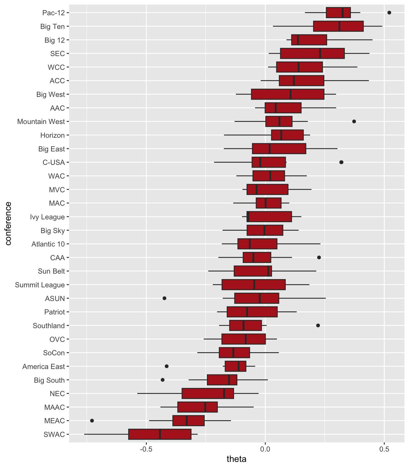 Examine the distribution of \(\theta\) by conference. The conferences are ordered by mean value of \(\theta\) within the conference. Here are some observations: