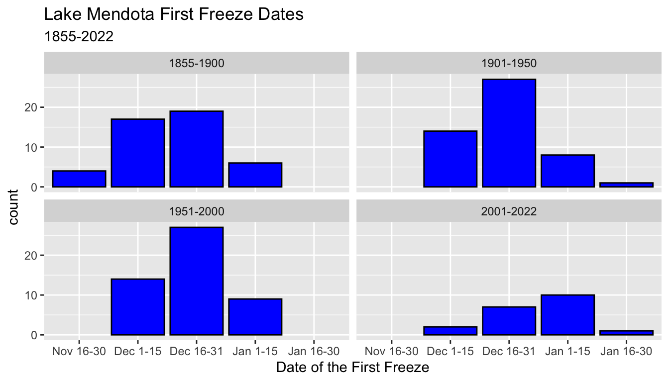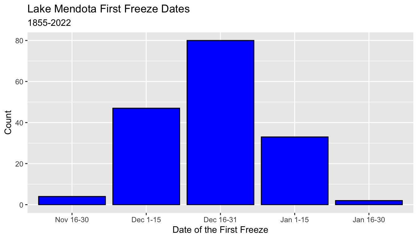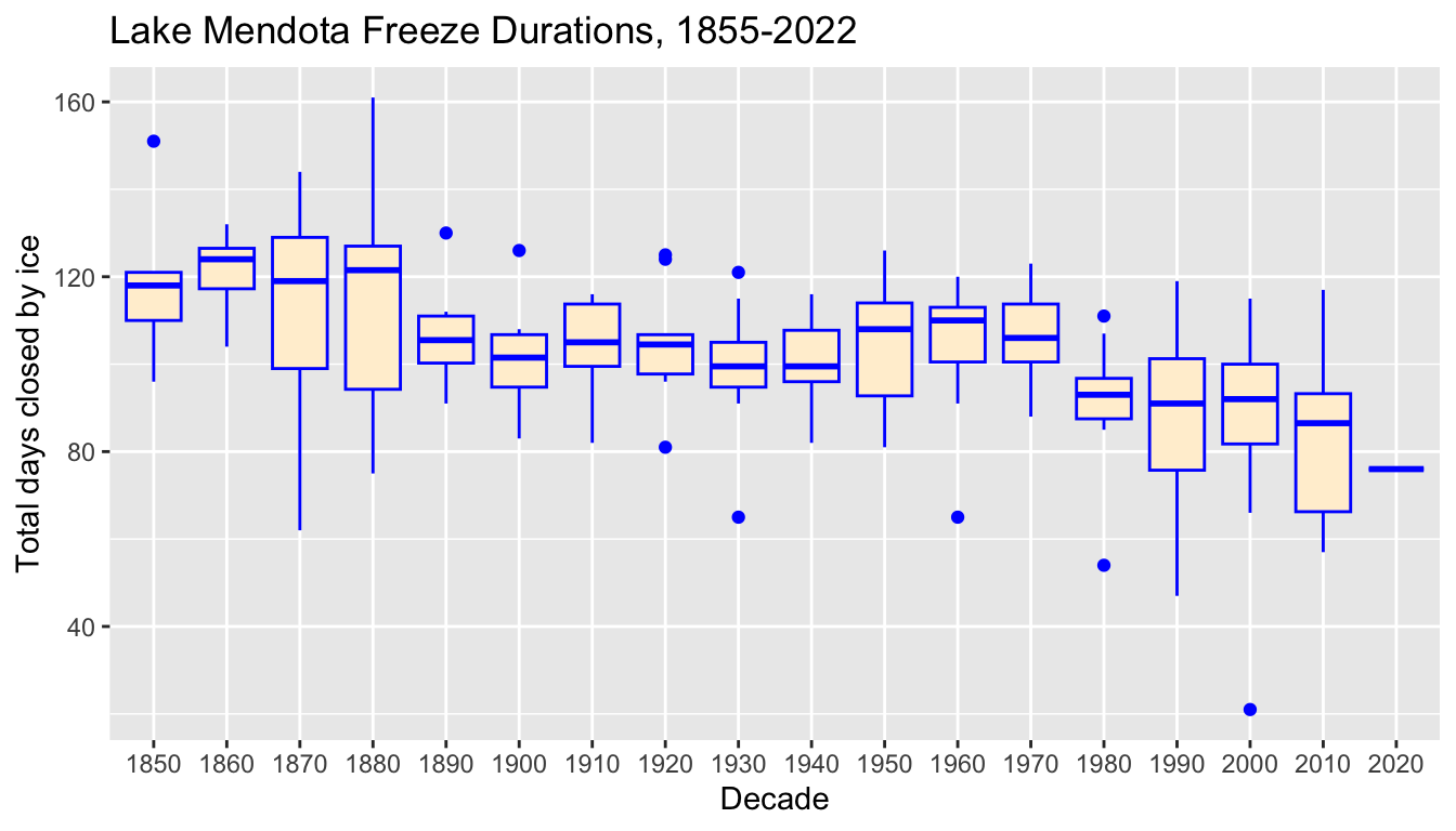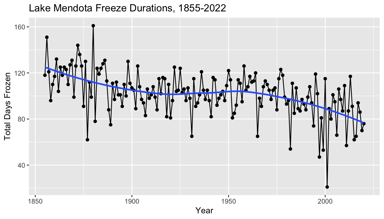 A previous chapter described the Lake Mendota case study which includes continuous data dating back to the mid 1800s with the dates in which Lake Mendota froze (the surface was 50% or more covered with ice and the path from Picnic Point to Maple Bluff was not open) and when it opened again. We will explore this data while learning to make several common plots.