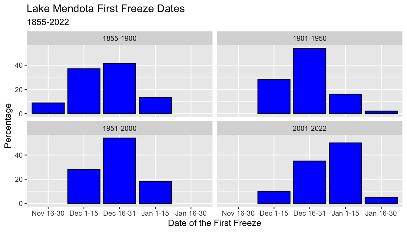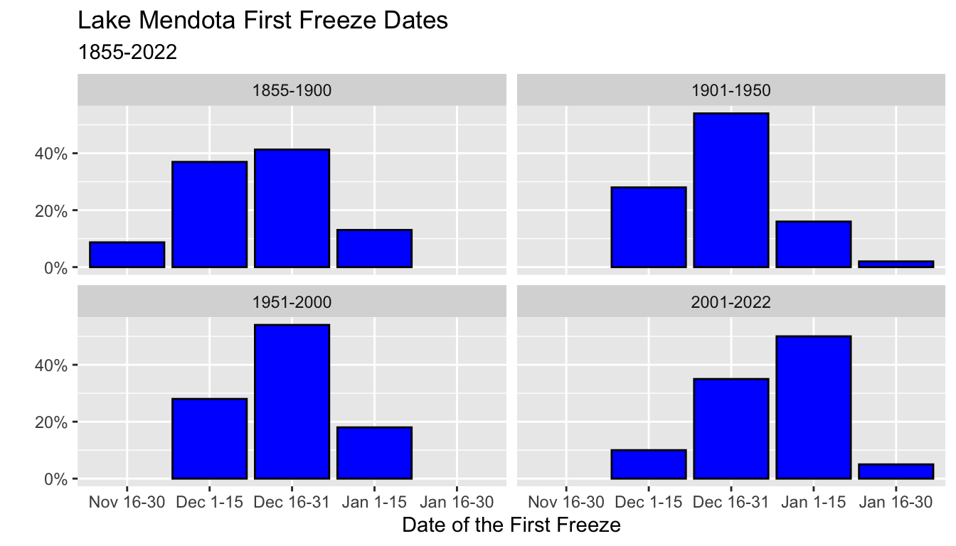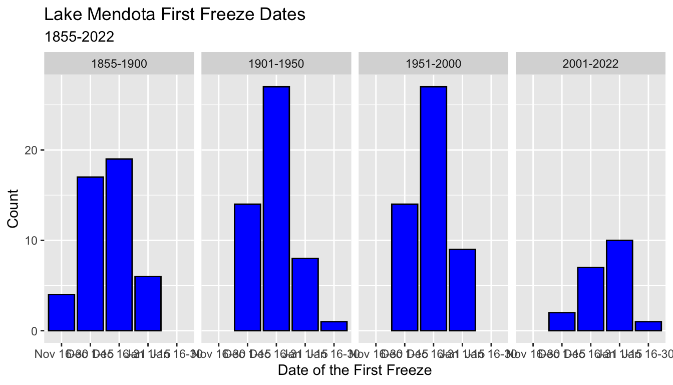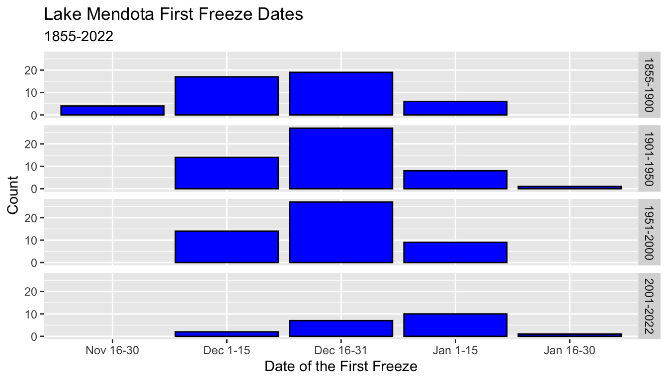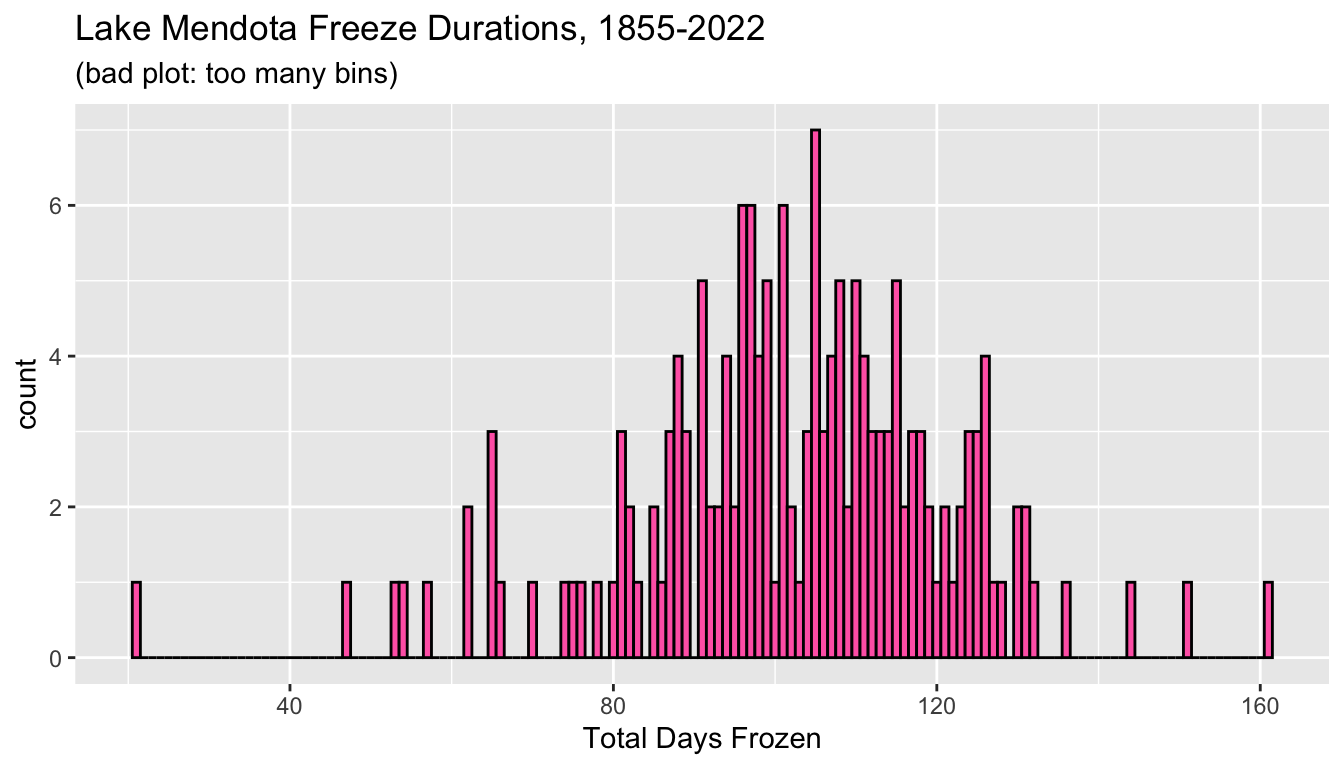 A previous chapter described the Lake Mendota case study which includes continuous data dating back to the mid 1800s with the dates in which Lake Mendota froze (the surface was 50% or more covered with ice and the path from Picnic Point to Maple Bluff was not open) and when it opened again. We will explore this data while learning to make several common plots.