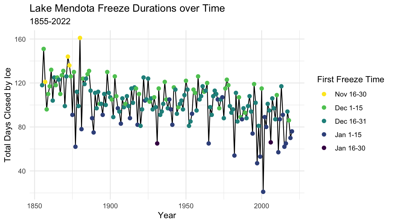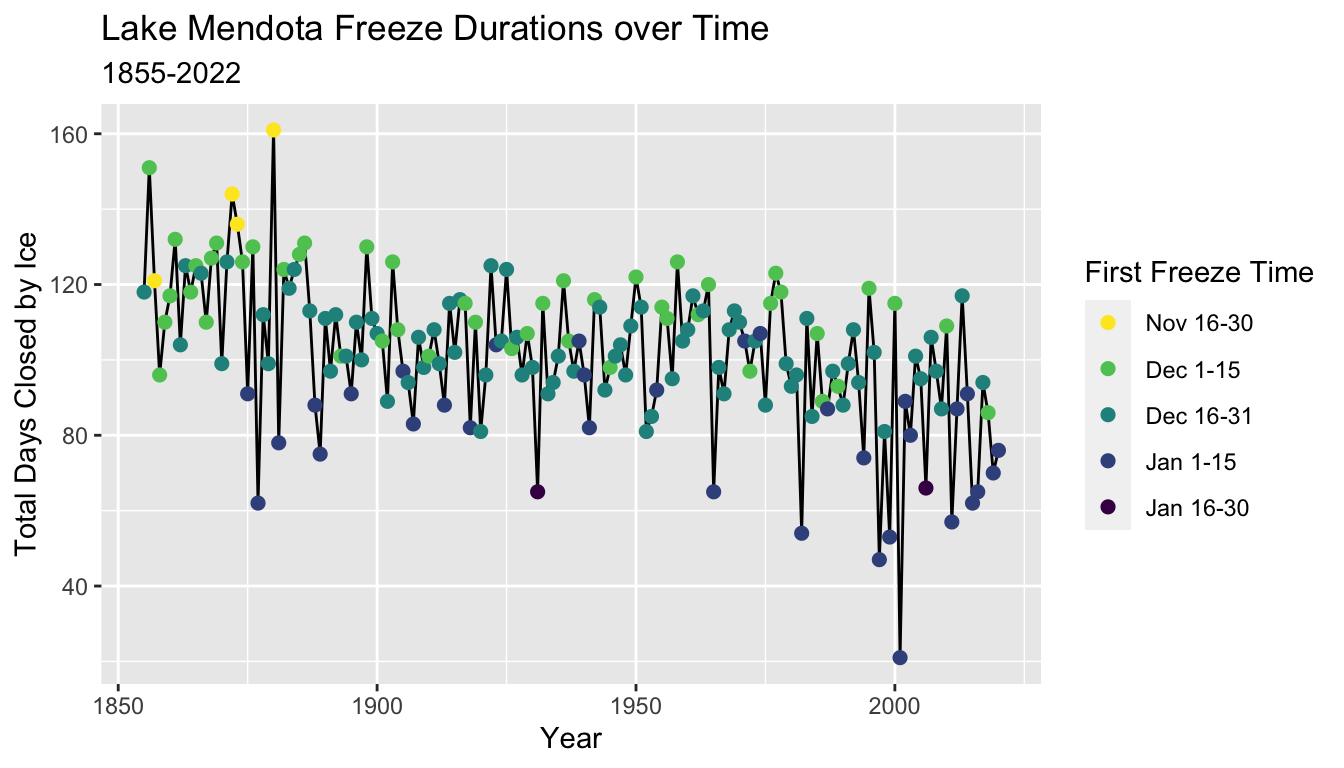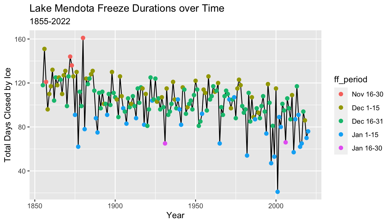 - Here, we make a trace plot of the total duration that Lake Mendota is closed by ice versus the year, but add color to indicate the half-month period of time of the date when Lake Mendota was first closed by ice