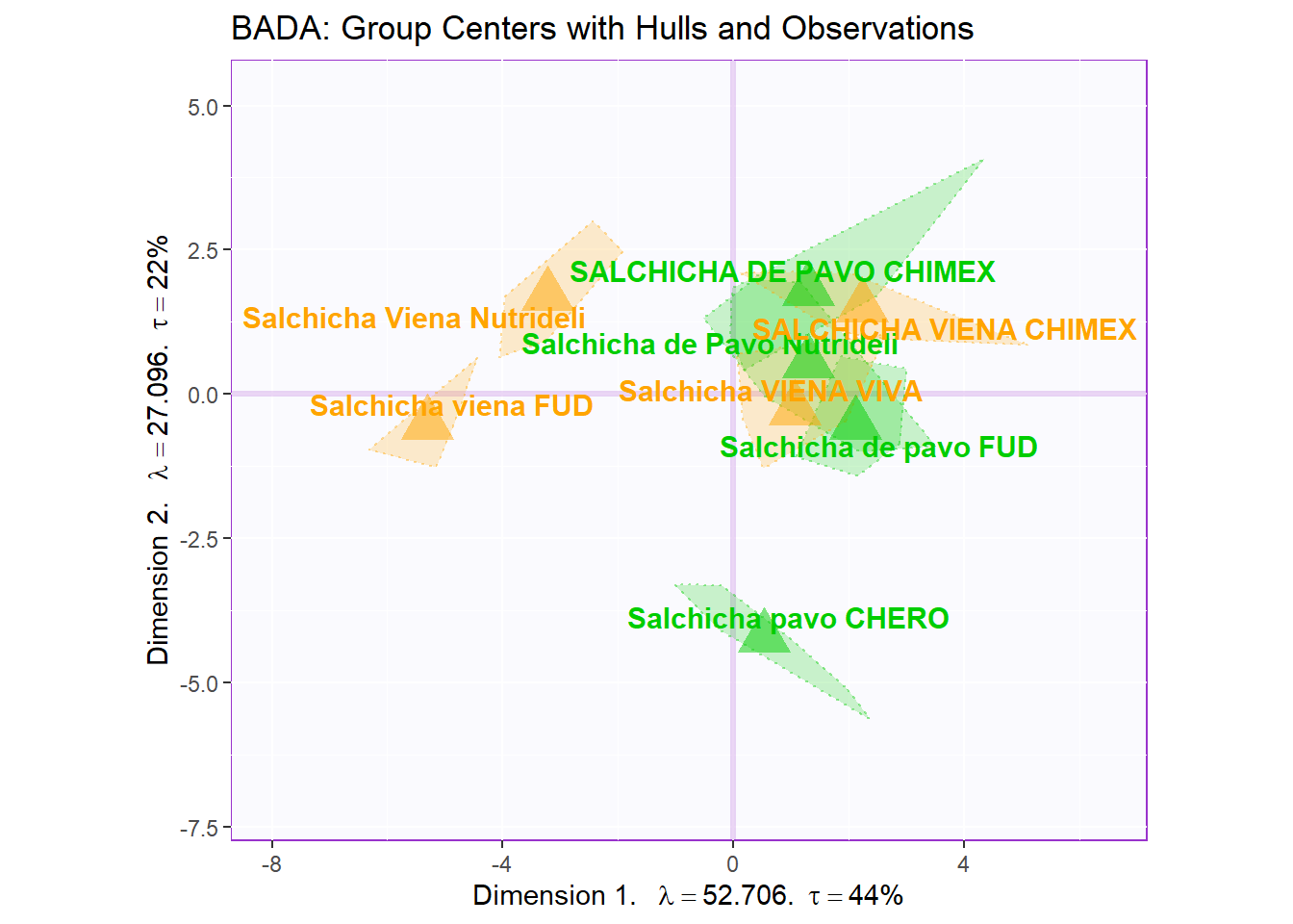 1. The Triangle data points are the Group Means (Barycenters) by Products.