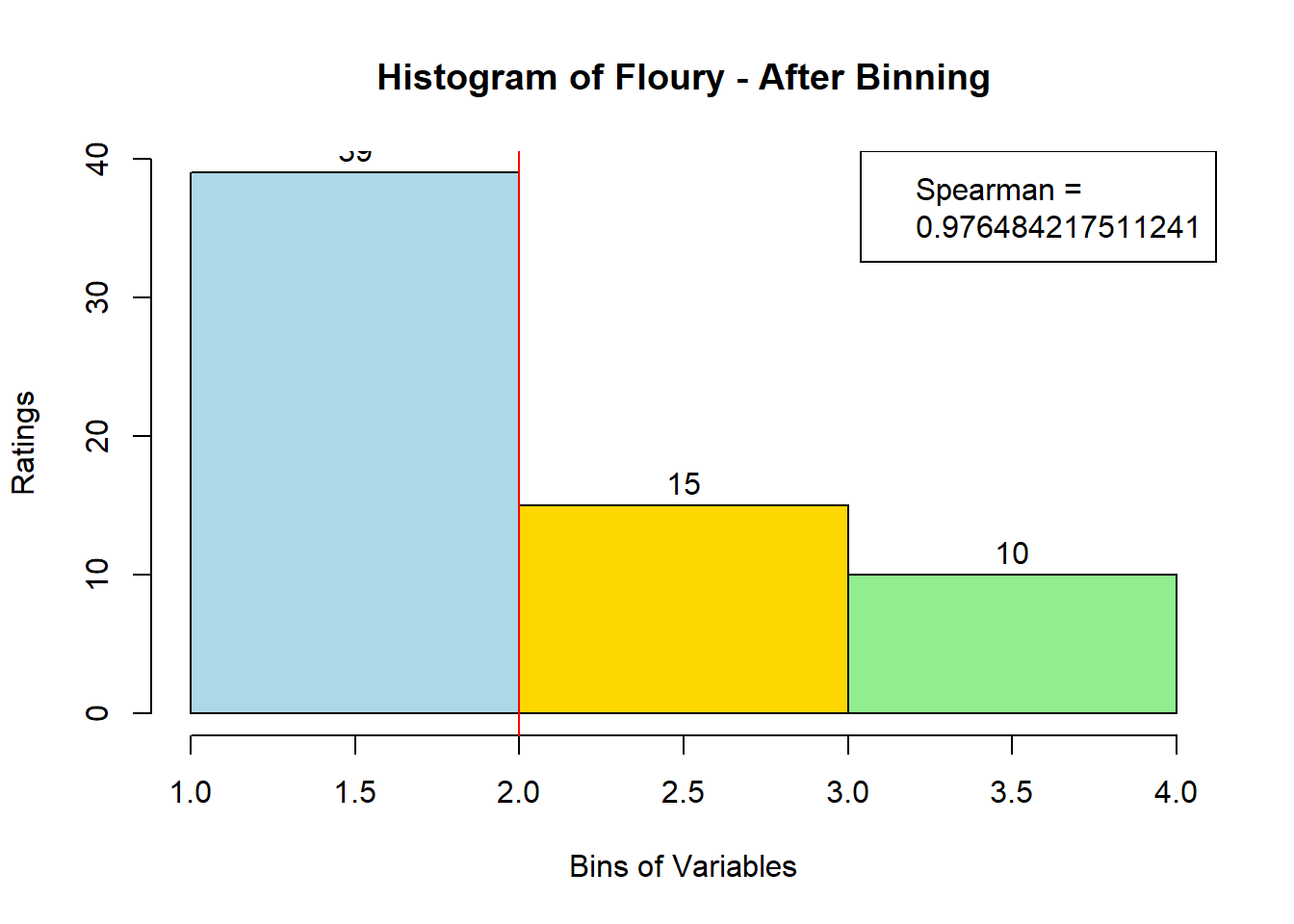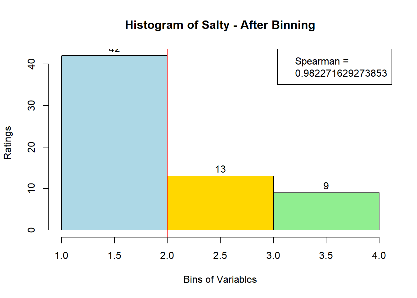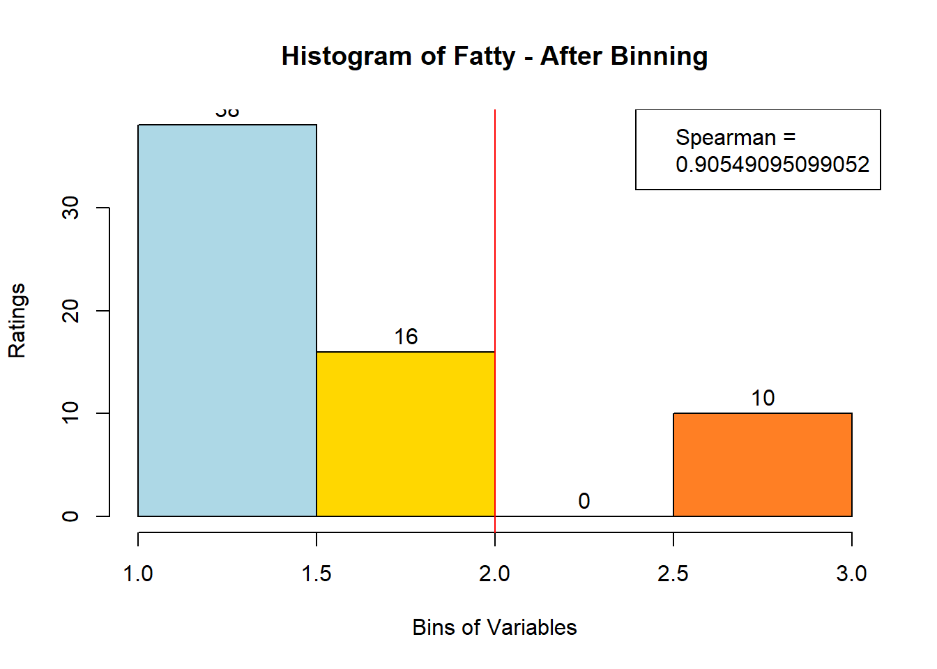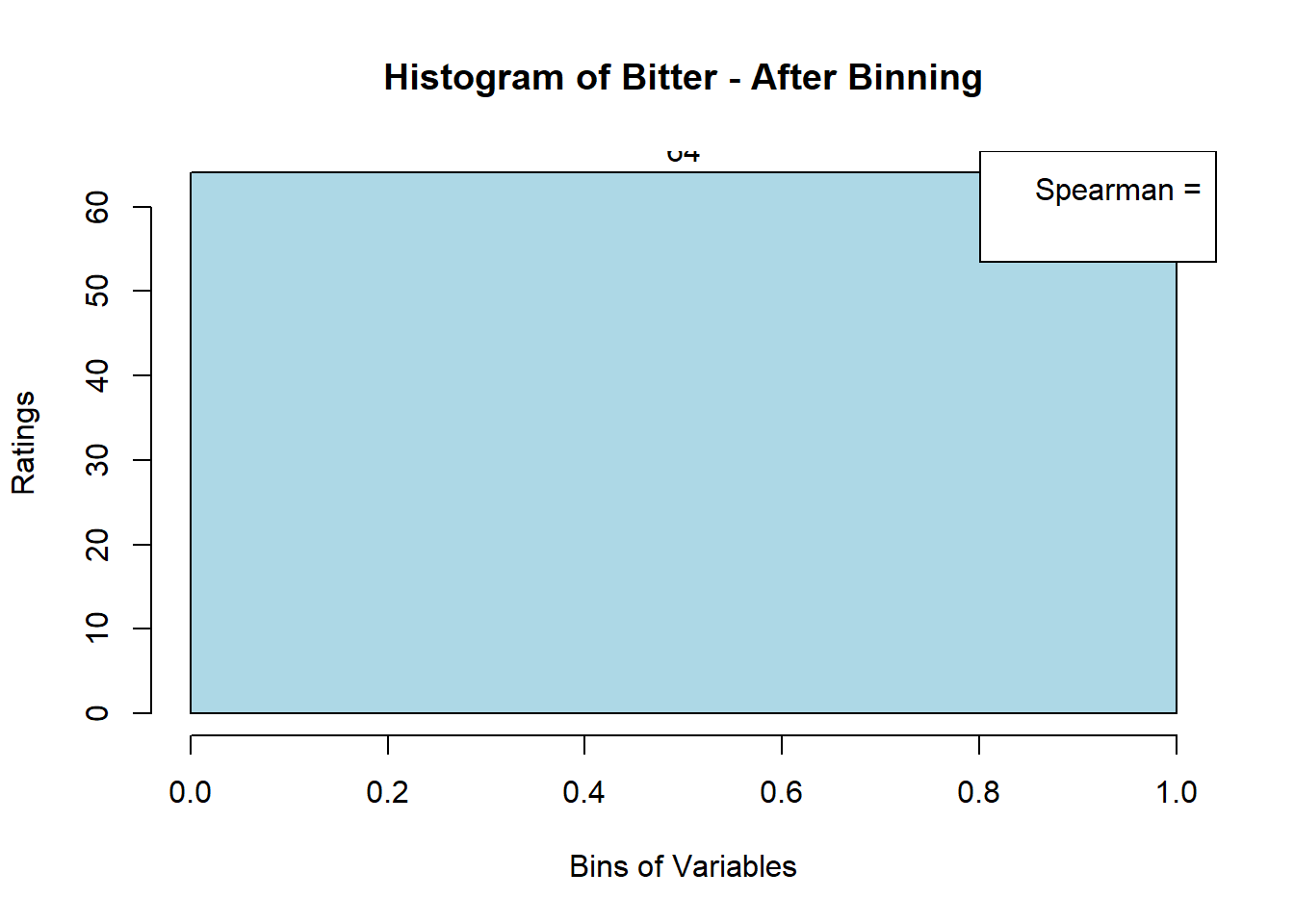 Next, after looking at the newly-filled bin_data, we see that 3 variables (Bitter-6, Fatty-13, HVP-14) had issue. We will attempt to bin them manually. Suspected reason: