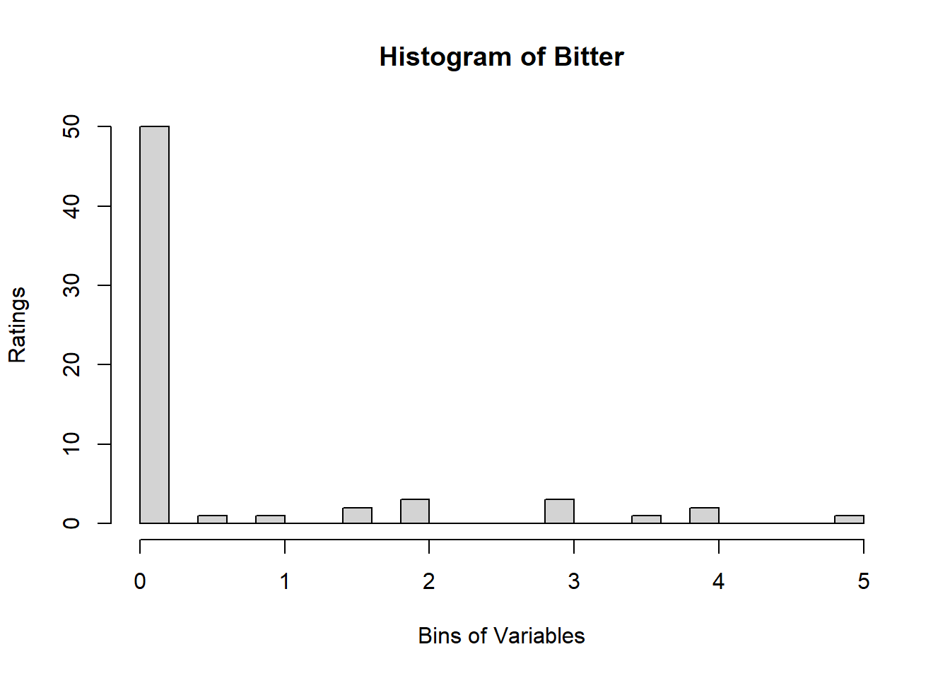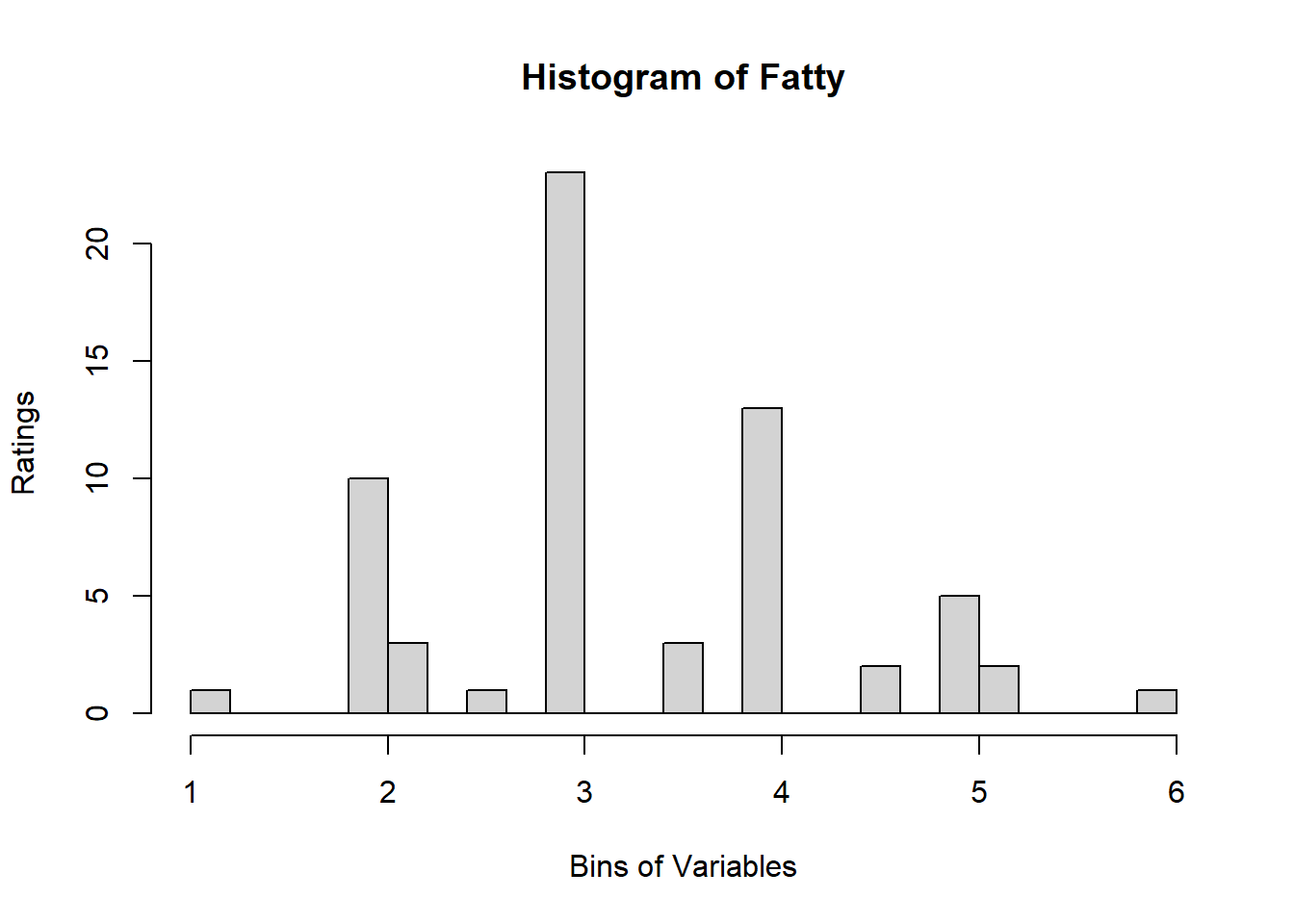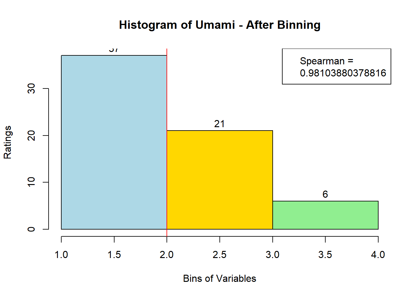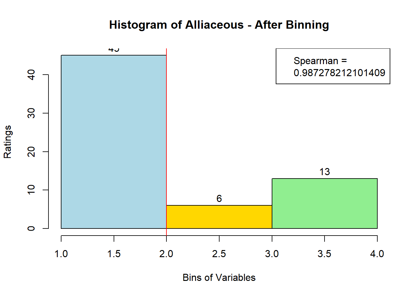 Next, after looking at the newly-filled bin_data, we see that 3 variables (Bitter-6, Fatty-13, HVP-14) had issue. We will attempt to bin them manually. Suspected reason: