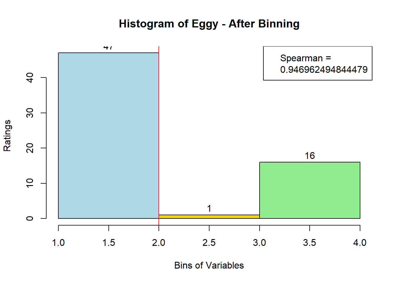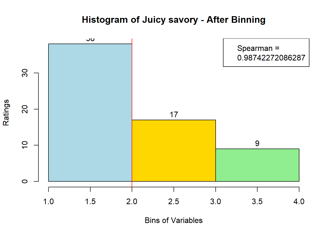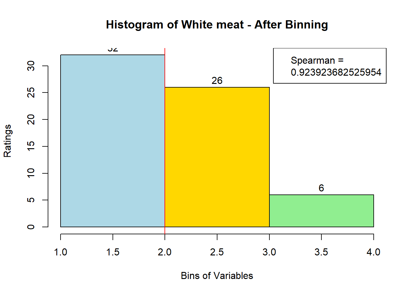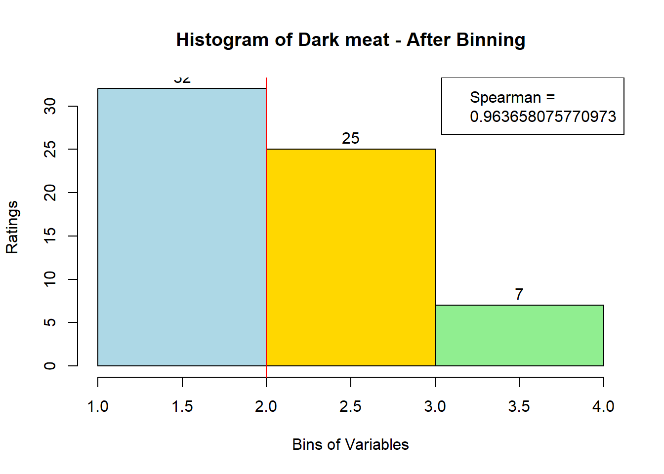 sausage.processed[,var_clust], nClass = 3, stem = '')Distribution, Sample size, and Spearman Correlation after Binning: