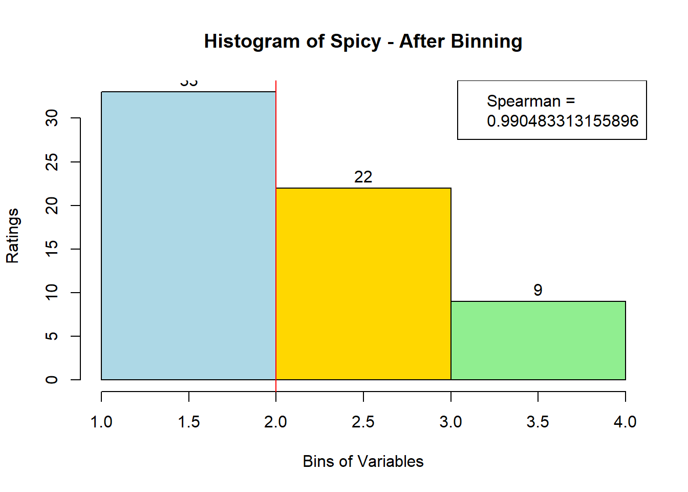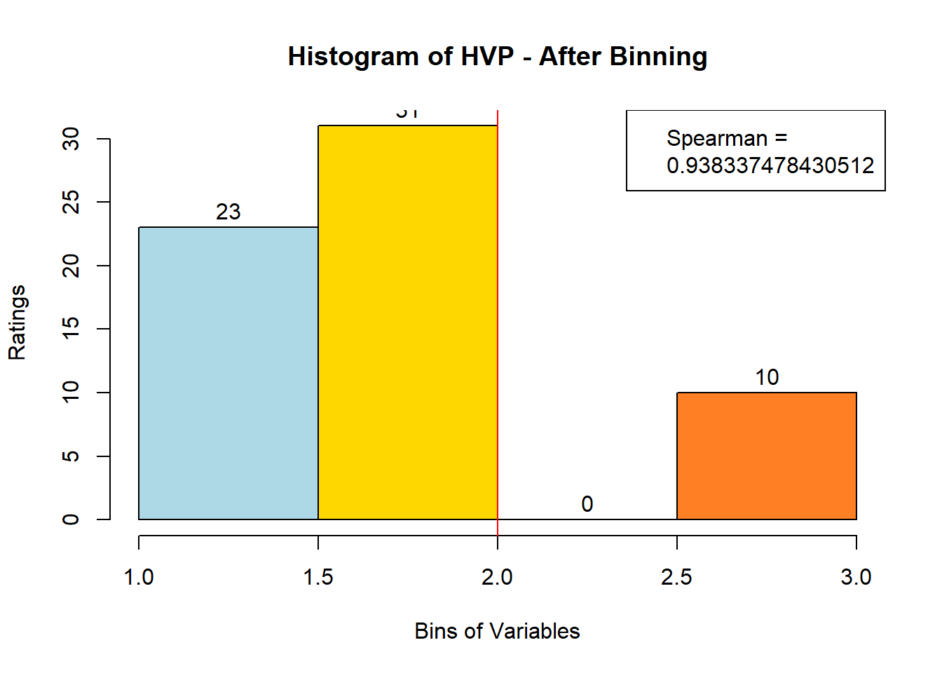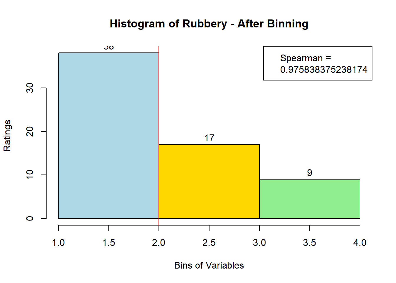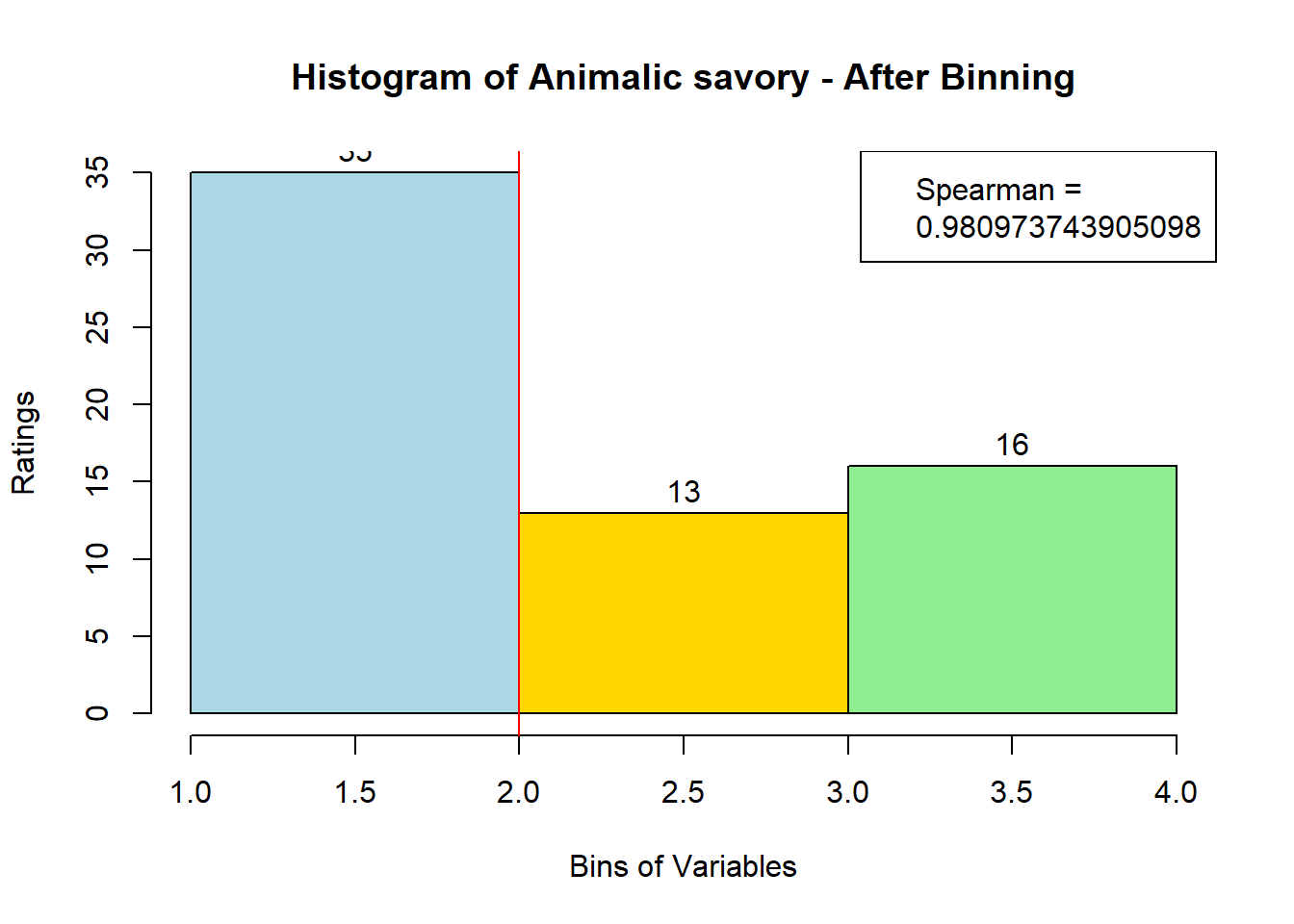 sausage.processed[,var_clust], nClass = 3, stem = '')Distribution, Sample size, and Spearman Correlation after Binning: