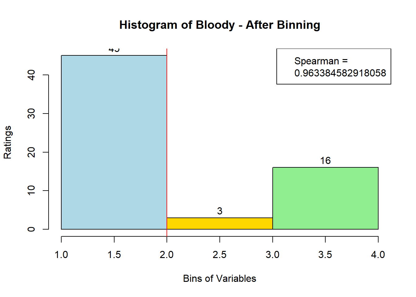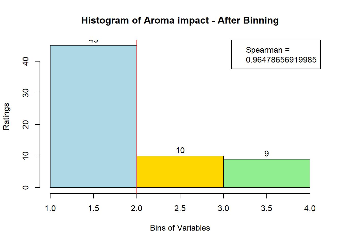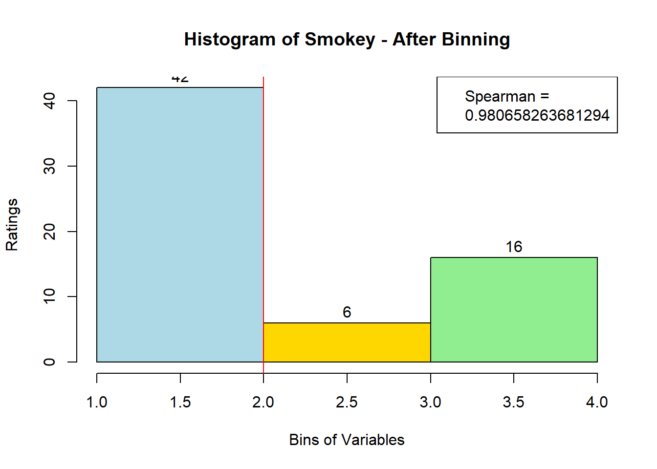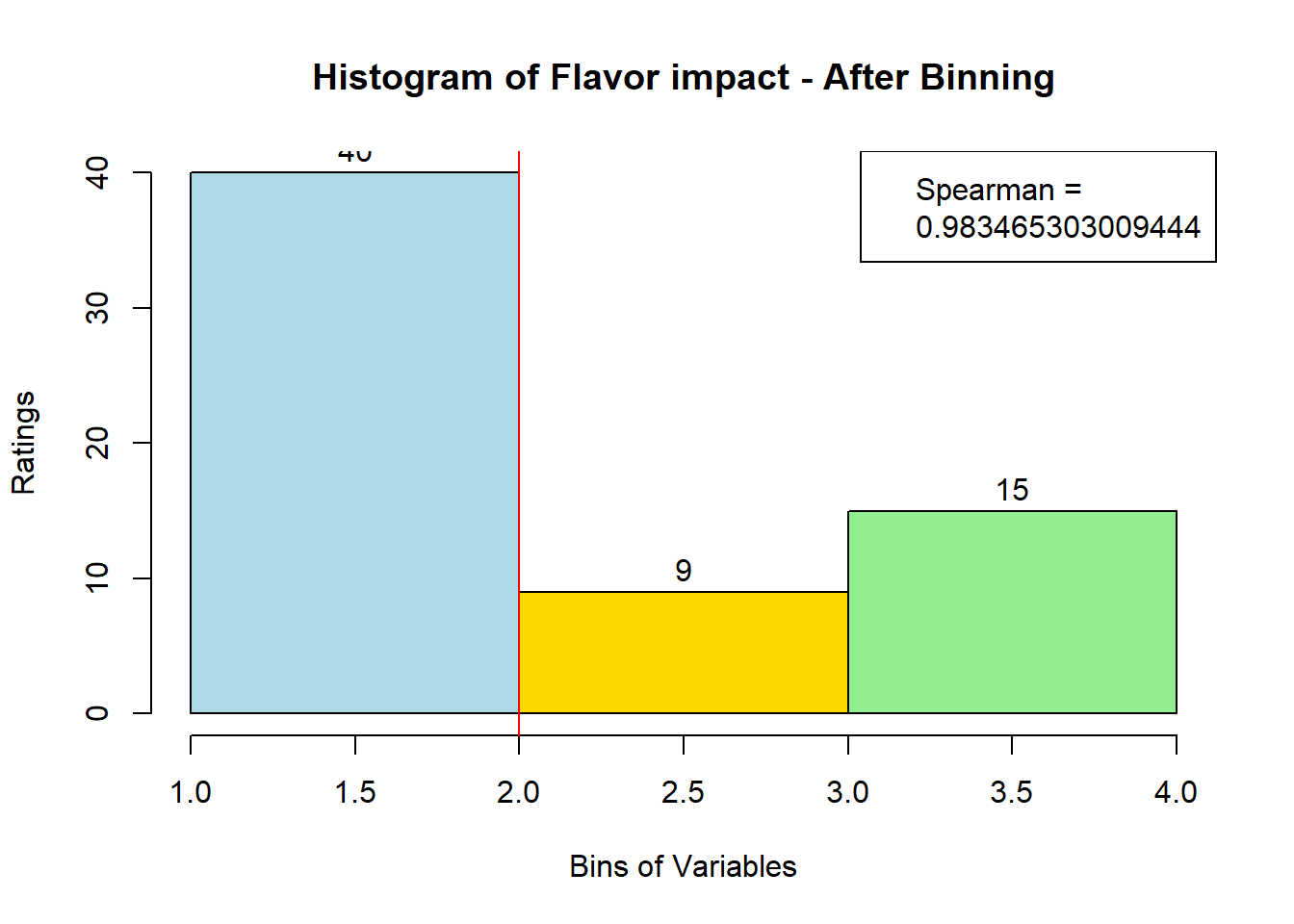 sausage.processed[,var_clust], nClass = 3, stem = '')Distribution, Sample size, and Spearman Correlation after Binning: