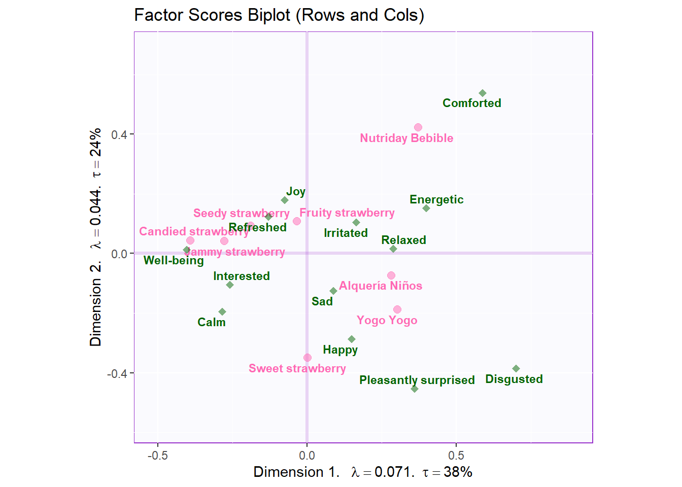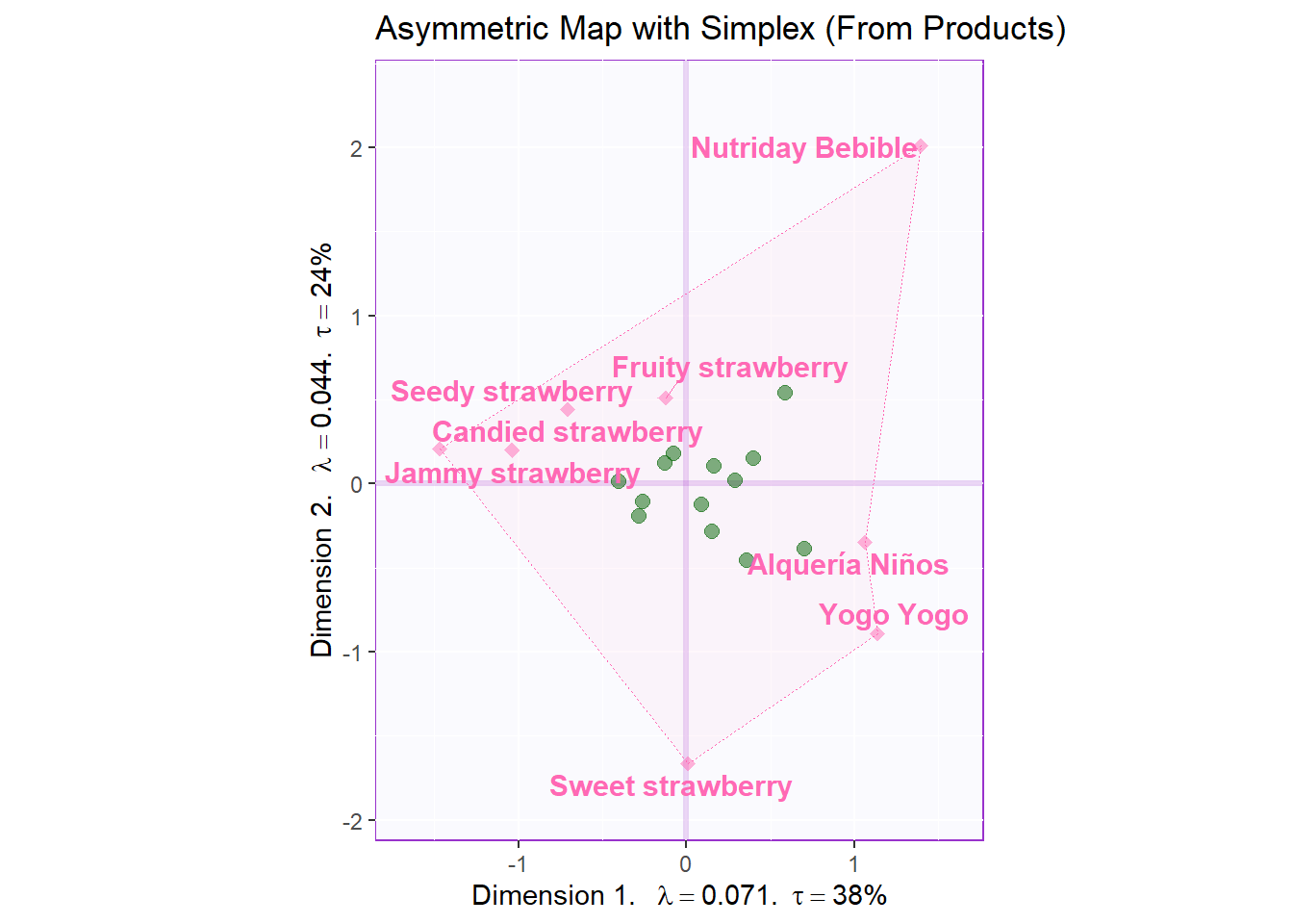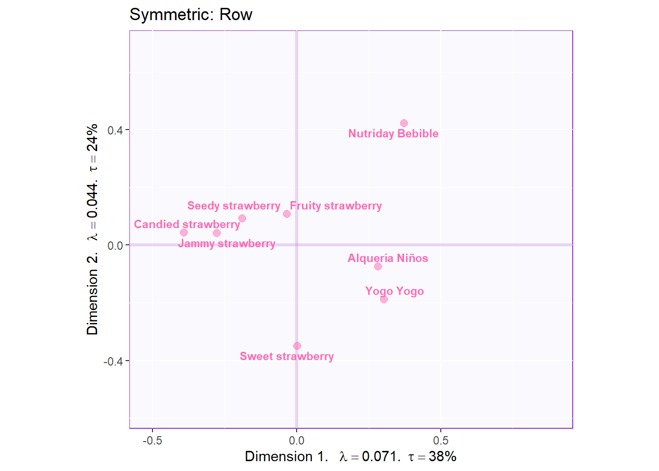 We can interpret asymmetric plot by assessing the proximity (distance between) each data points (can be done for both rows and columns).