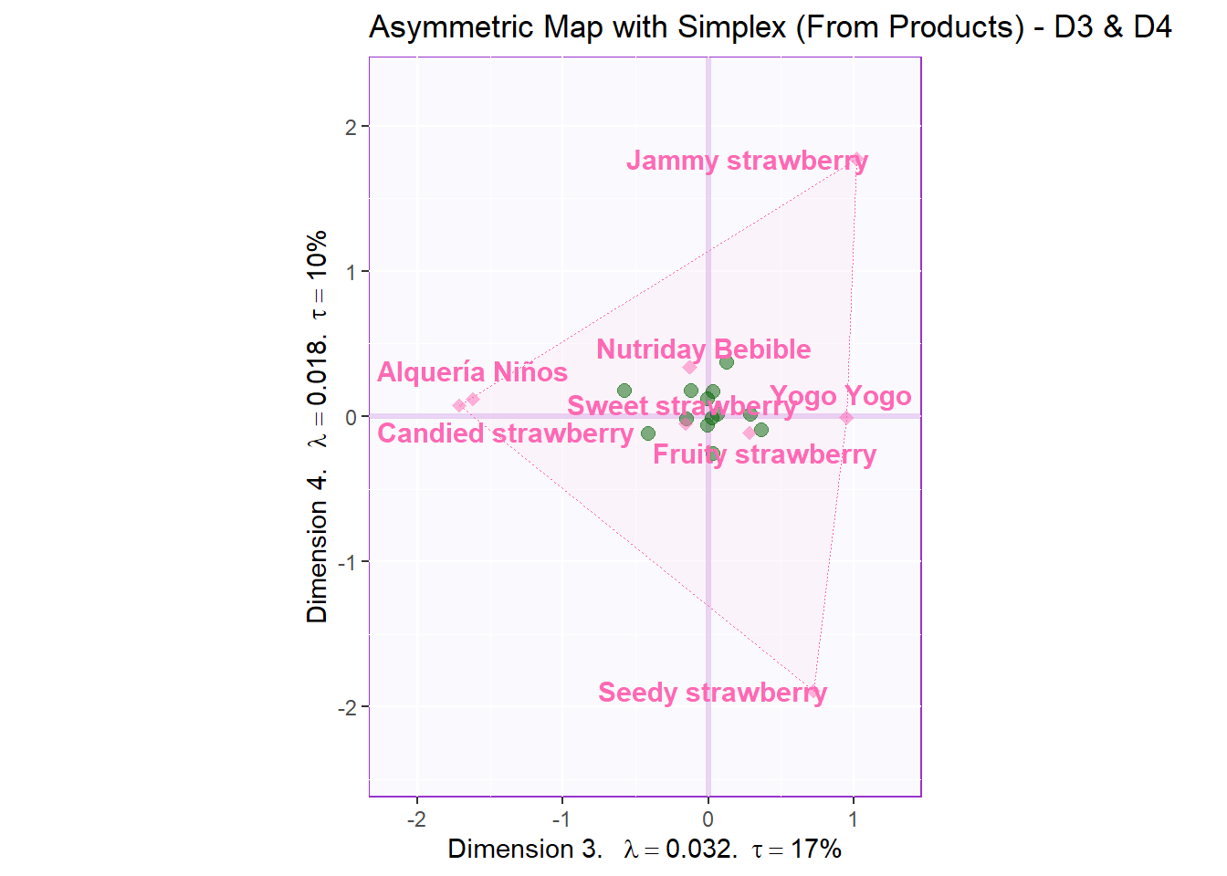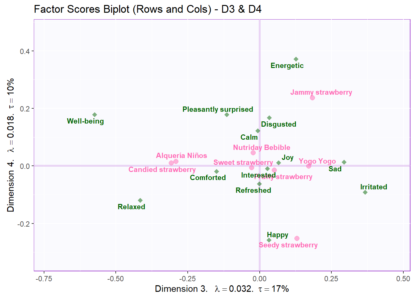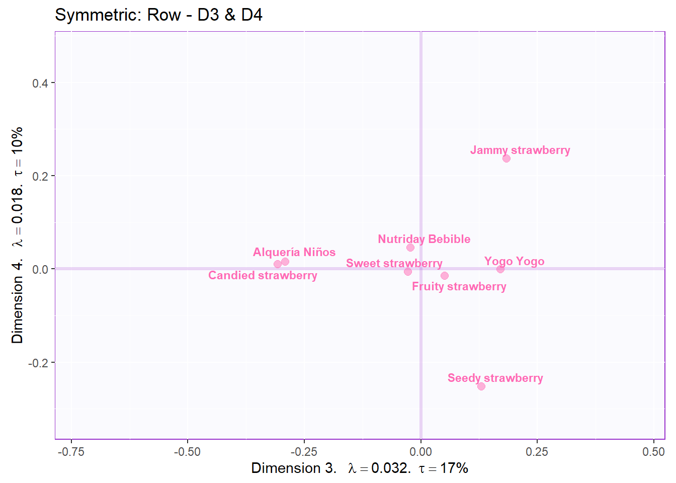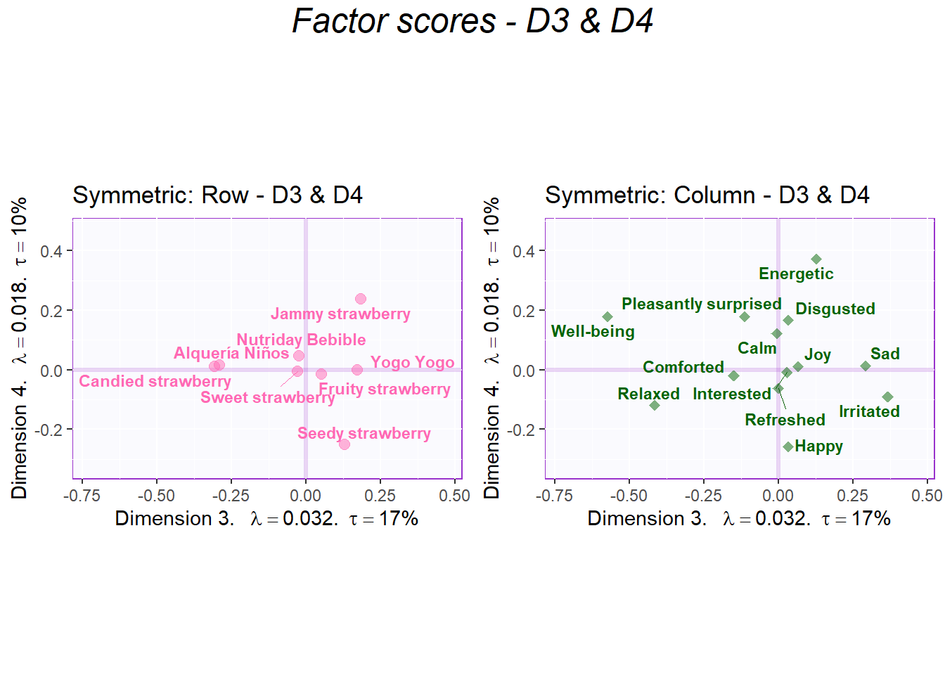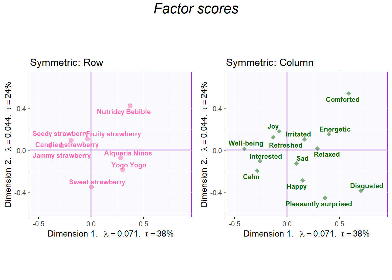 CA and its inference analysis (boot, CI, TI, eigenvalue tests, scree) can be done by InPosition. Also, note that there are 2 ways to perform CA: symmetric and asymmetric (find definition above). We should perform both for either rows or columns or both. In the case of this sensory profile dataset where there is subjectivity to be balanced in both rows and columns, it is recommended that we do both tests (symmetry and asymmetry) for both rows and columns.