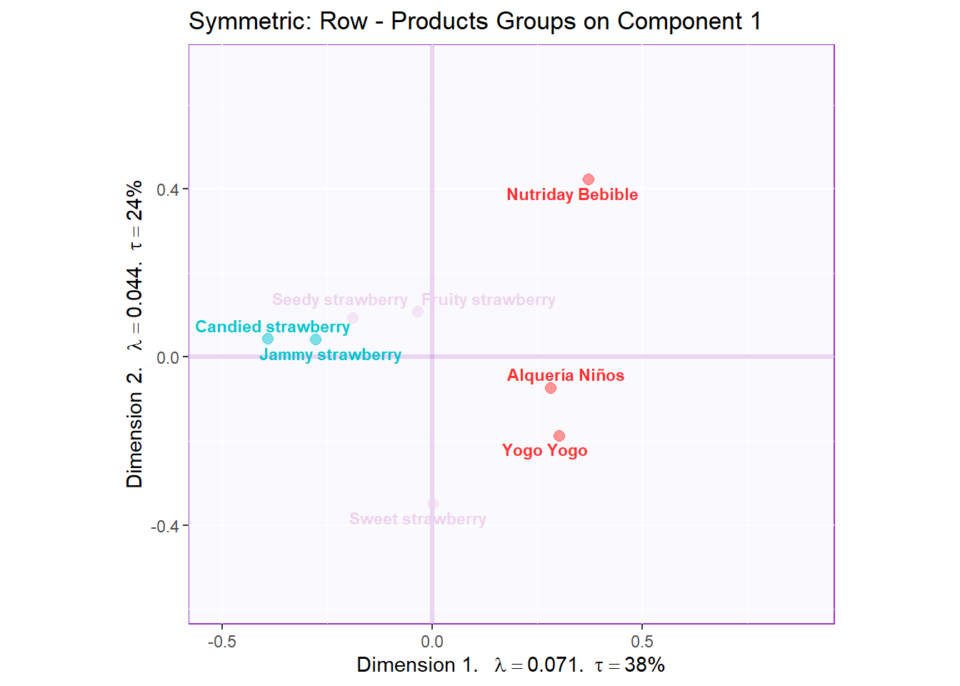 ggtitle('Symmetric: Row - Products Groups on Component 1') +
