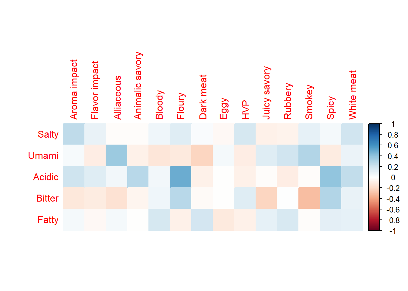 From the heat map, we can see that there is a mixed of both positive and negative correlation between the 2 sets of varaibles (leaning positive). Noticably, umami relates with most of its synonymous flavors such as alliaceous, juicy savory, smokey except HVP and animalic savory.
