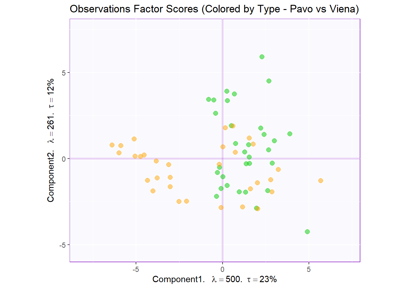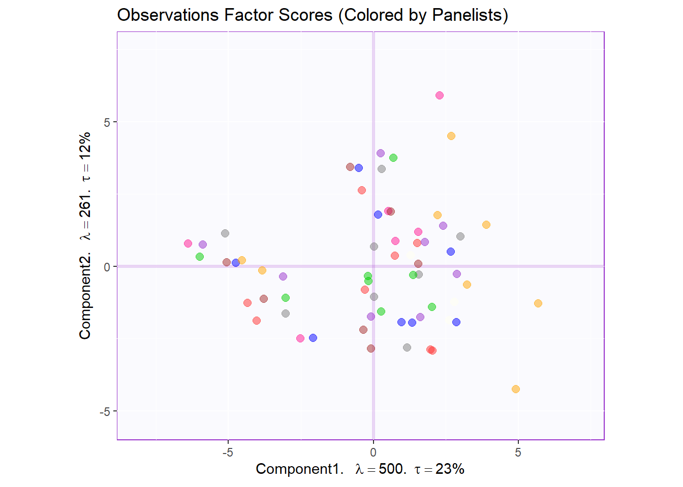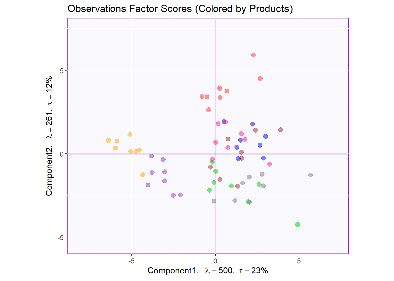 We will map all observations onto the newly-formed Principal Components. Keep in mind that we interpret Factor Scores (aka Row Factor Map) by distances between data points. It is important that we show insights from multiple perspectives. Thus, we will perform 3 Factor Scores with 3 different groupings (colored accordingly). We will be stacking different maps as layers on top of teach others.