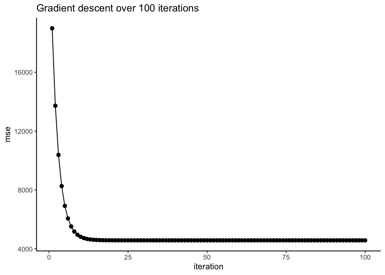 From the tibble above, we can see that the parameter values (slope and intercept) approach what we’ve gotten earlier from the linear model (1.83 and 4.99, respectively). The MSE also decreases over iterations, which we can visualize: