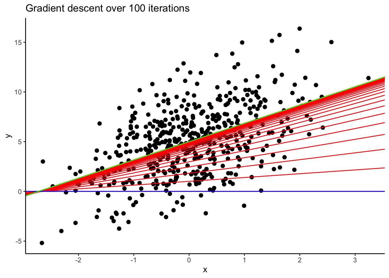 As a visual aid to see how gradient descent is working, we can visualize the regression line at each iteration over our synthetic data. Here, the blue line indicates the regression line at the first iteration, which has a slope and intercept of 0 (since we initialized them at 0). Over the 100 iterations, the regression line approaches the line of best fit we obtained earlier using lm(). The green line indicates the line at the 100th iteration.