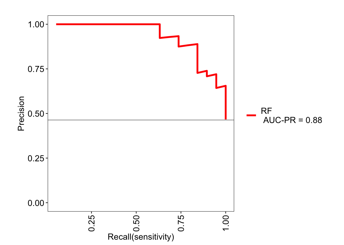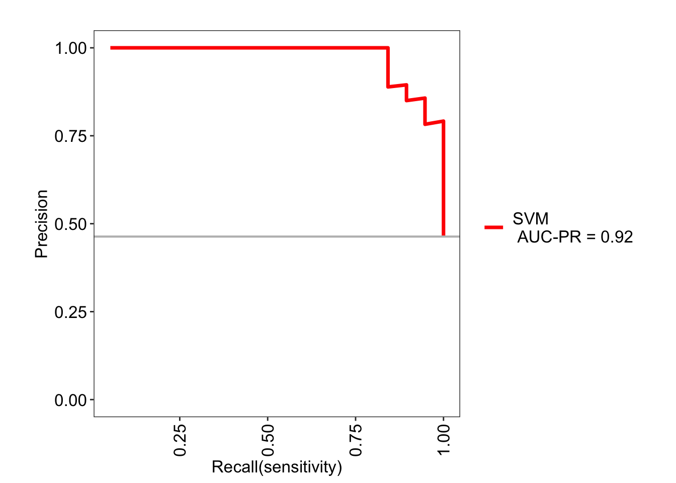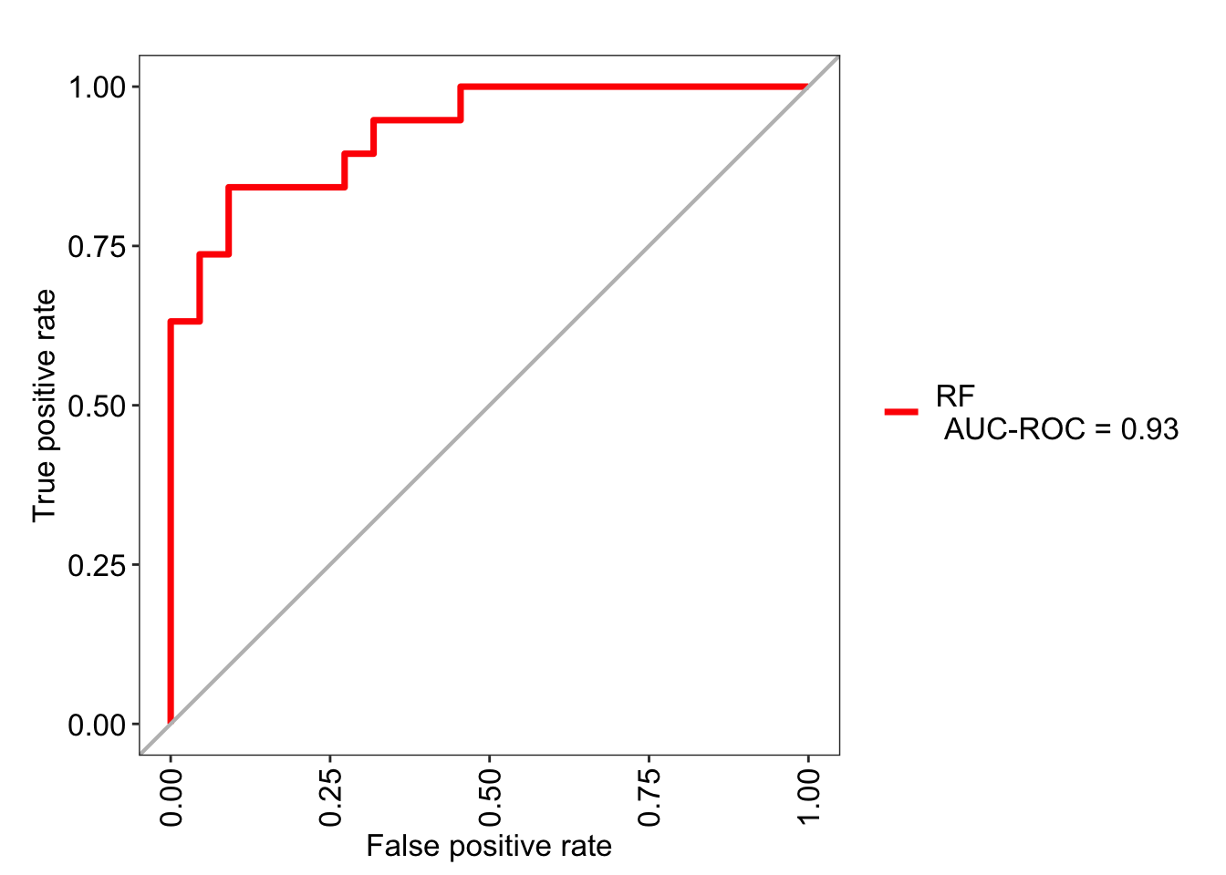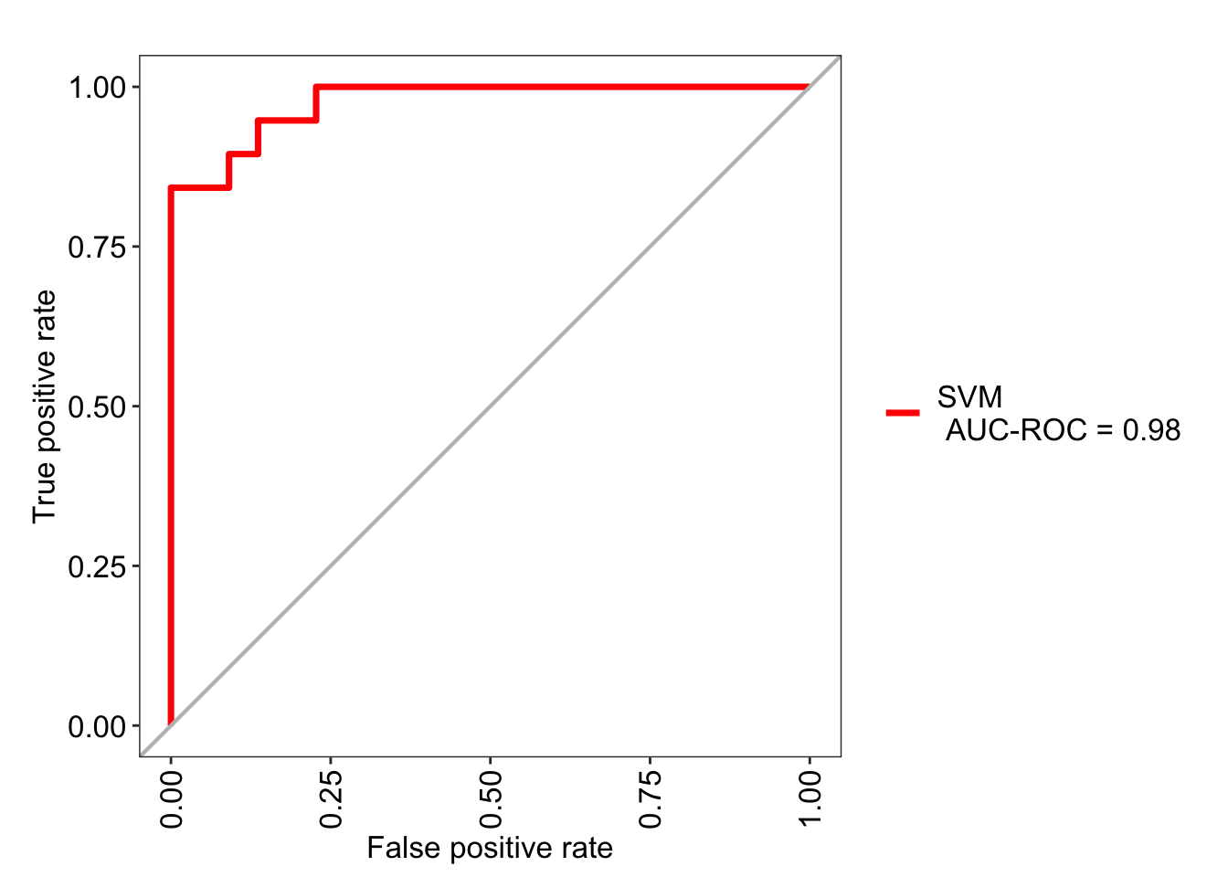 The package MLeval can be used to generate ROC curves as such; here we achieve the ROC area under the curve of 0.96.