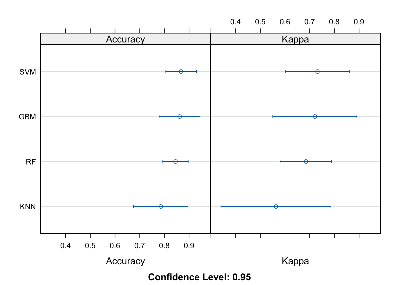 Both accuracy and kappa are then used to compare the model performance across the four models: