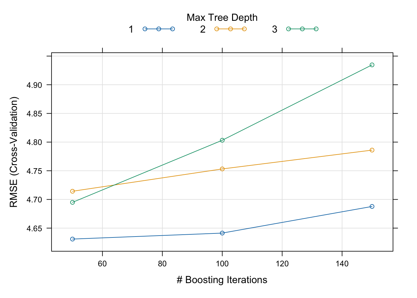 We’re using the trControl defined previously, with a grid search for alpha and lambda (the shrinkage parameter). As before, calling bestTune prints out the set of hyperparmeters tested with the lowest loss.