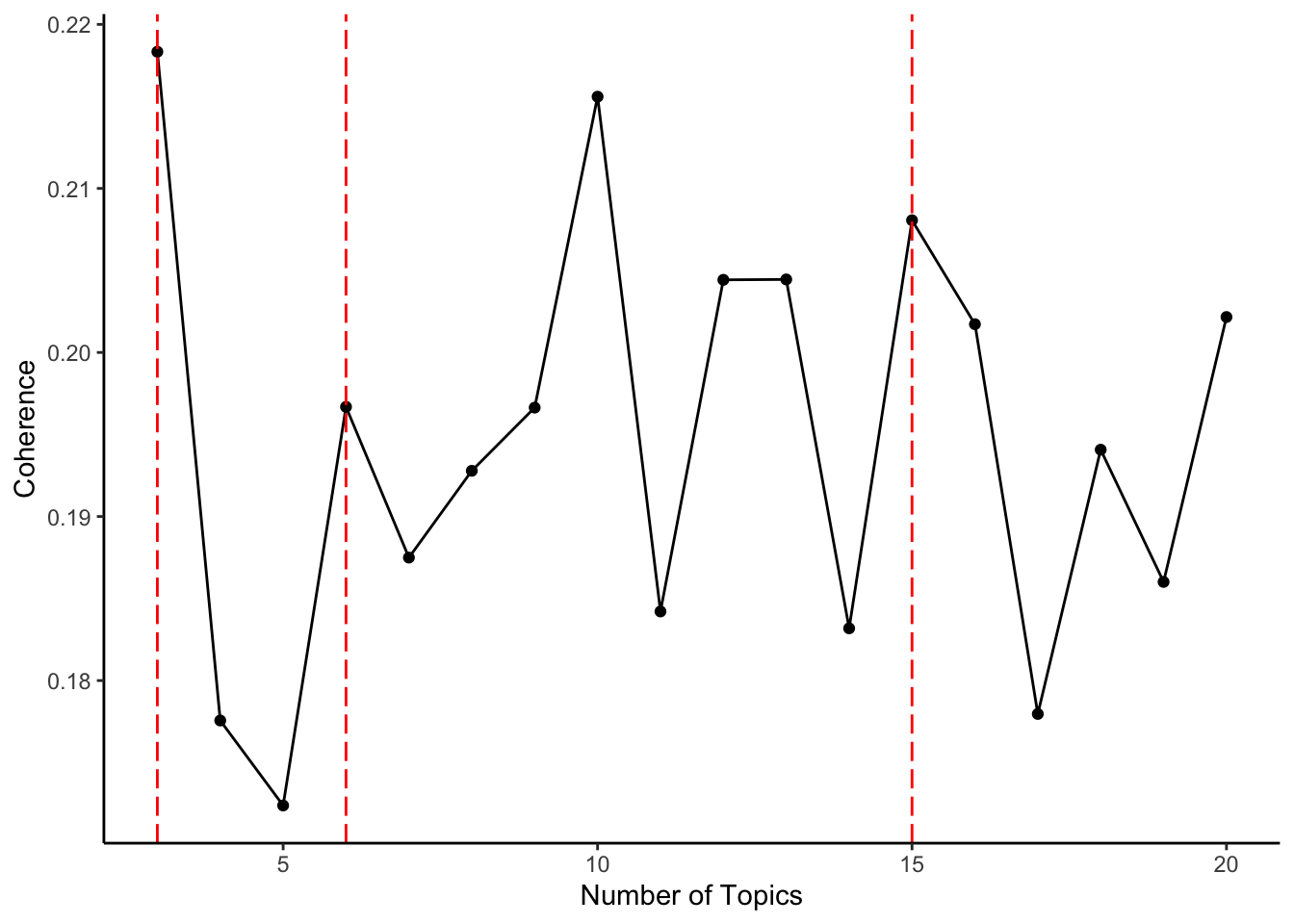 There are a number of different types of topic coherence, but this is one way we used. We were calculating the normalized pointwise mutual information (NPMI), but there are others you can use (e.g., https://search.r-project.org/CRAN/refmans/text2vec/html/coherence.html). Here, in the following code we iterate between 3 to 20 topics by 1 (aka every single number and not skipping any). Note: the code for the coherence metrics was written by Daniel Racek, I tried and panicked, so he helped me figure it out.