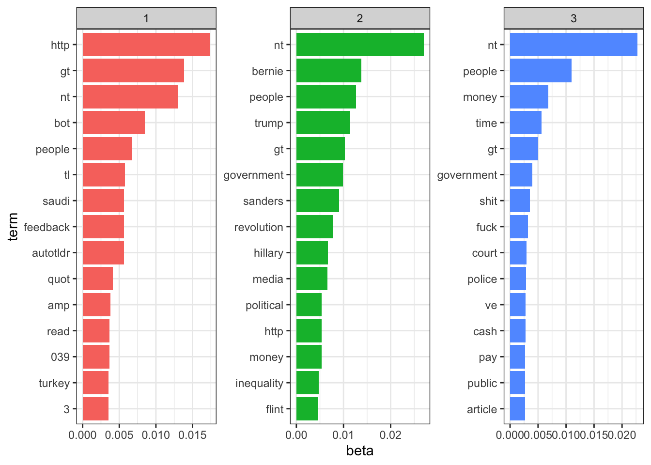 While the removal of stop words has helped here, there are a number of words that are not great (e.g., ‘nt’, ‘http’), which can be added to a list in order to filter out words further. However, the key here is to focus on the topics and whether they make sense: we can see topic 2 mentions names of politicians, whereas topic 3 looks more at money and the police.