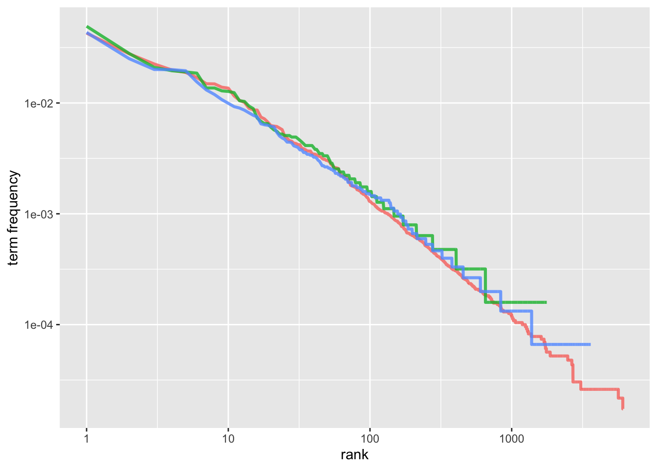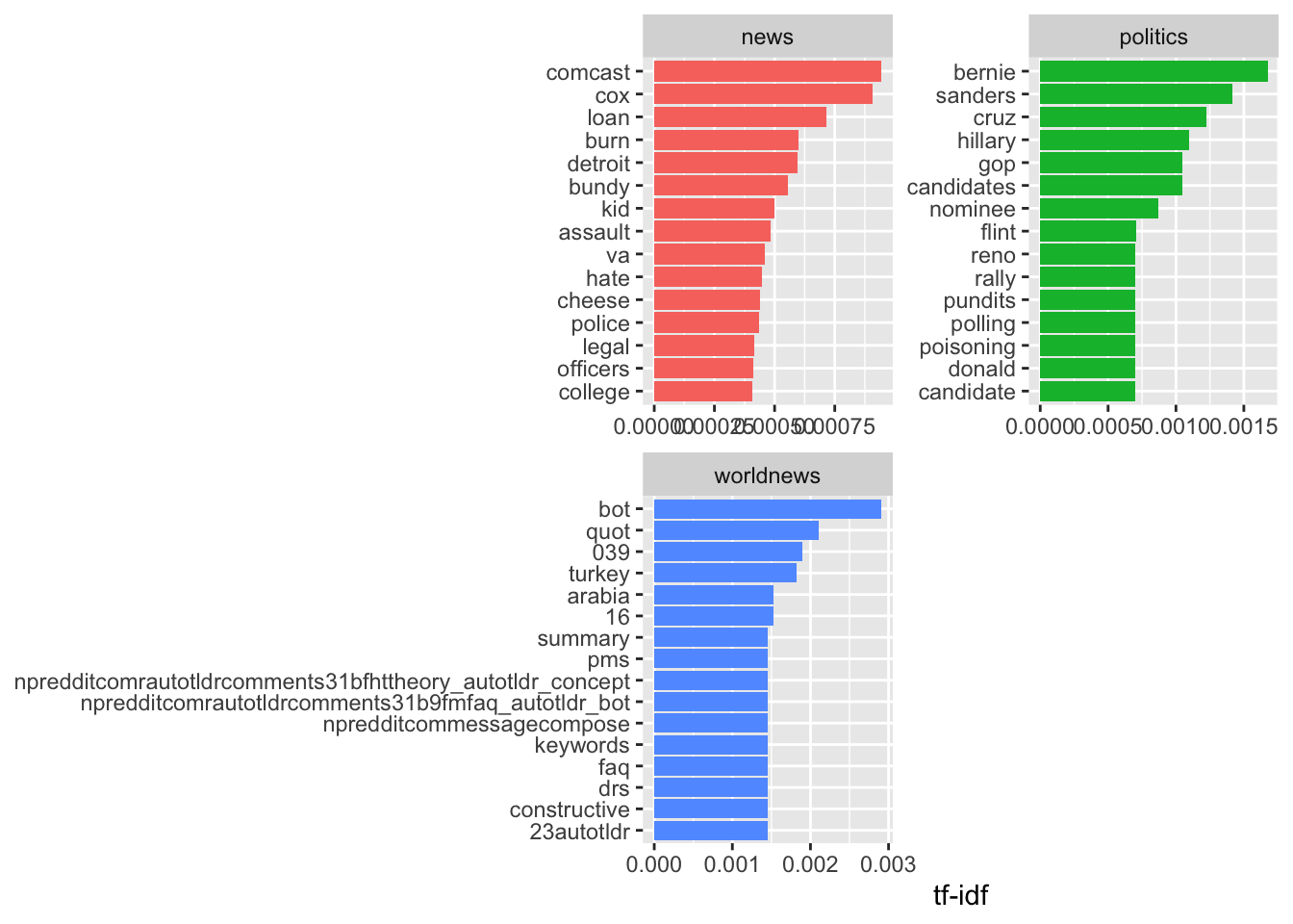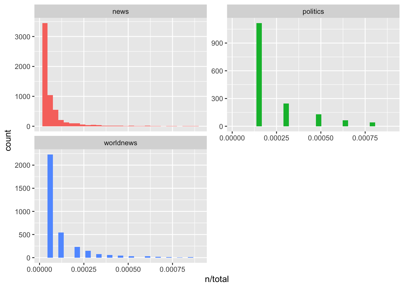 dplyr::count(subreddit, word) %>% #this means we have split these data into 3 documents