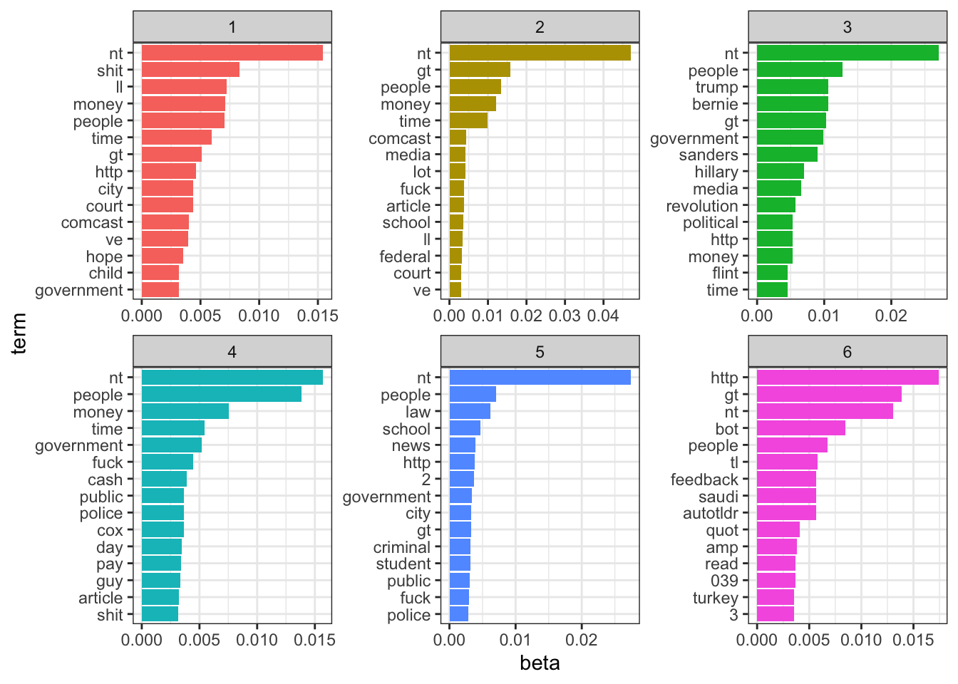 When you look at topic model outputs, it is important to carefully consider the words in there and how they come together into a topic, and whether this is the appropriate number. For instance, look here when we re-run this with 6 topics: