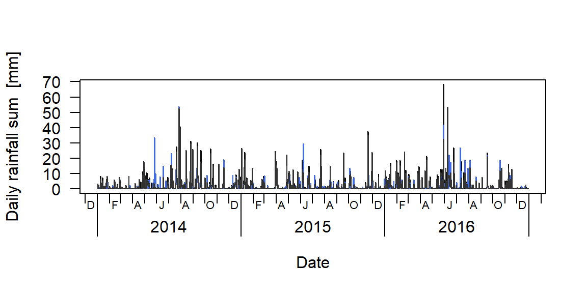 las=1, xaxt="n", xlab="Date", ylab="Daily rainfall sum [mm]")