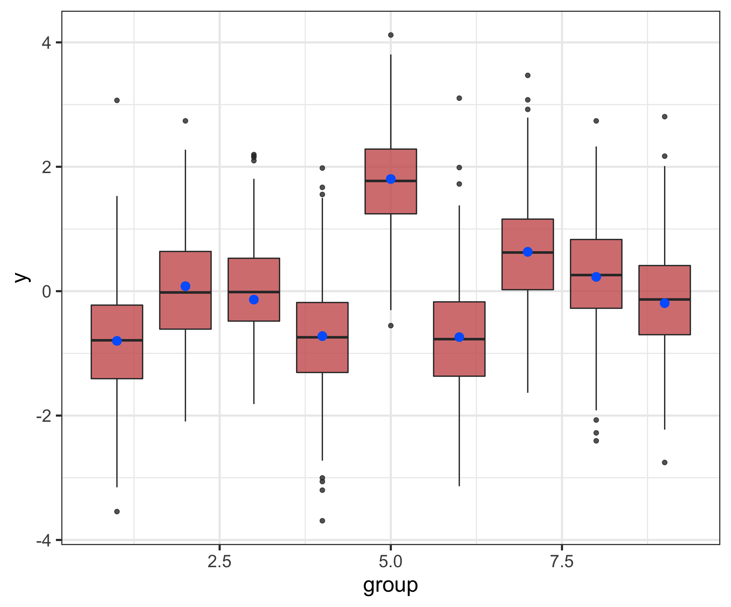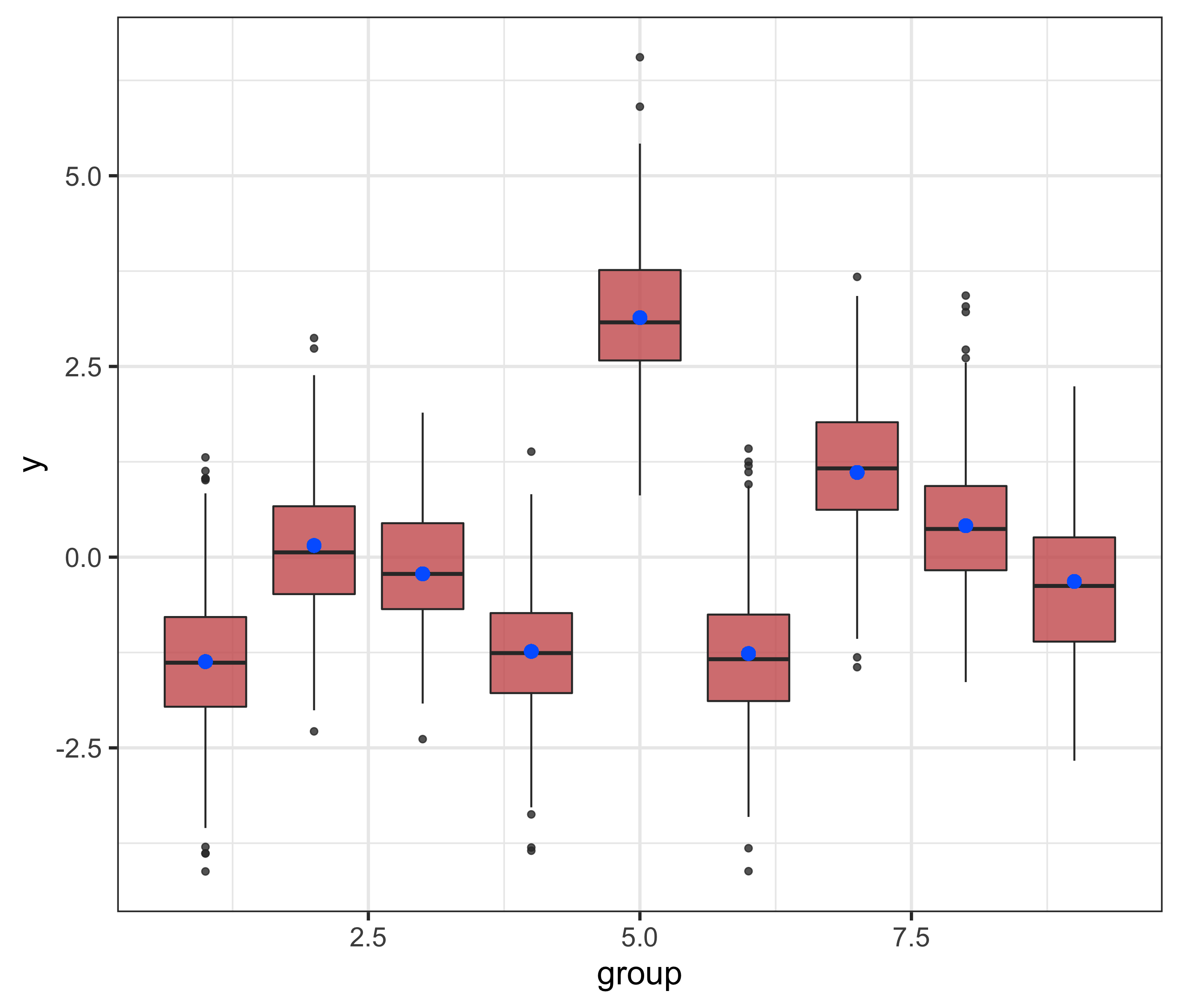This first plot is just a summary of the distribution of the simulated data, using 9 groups