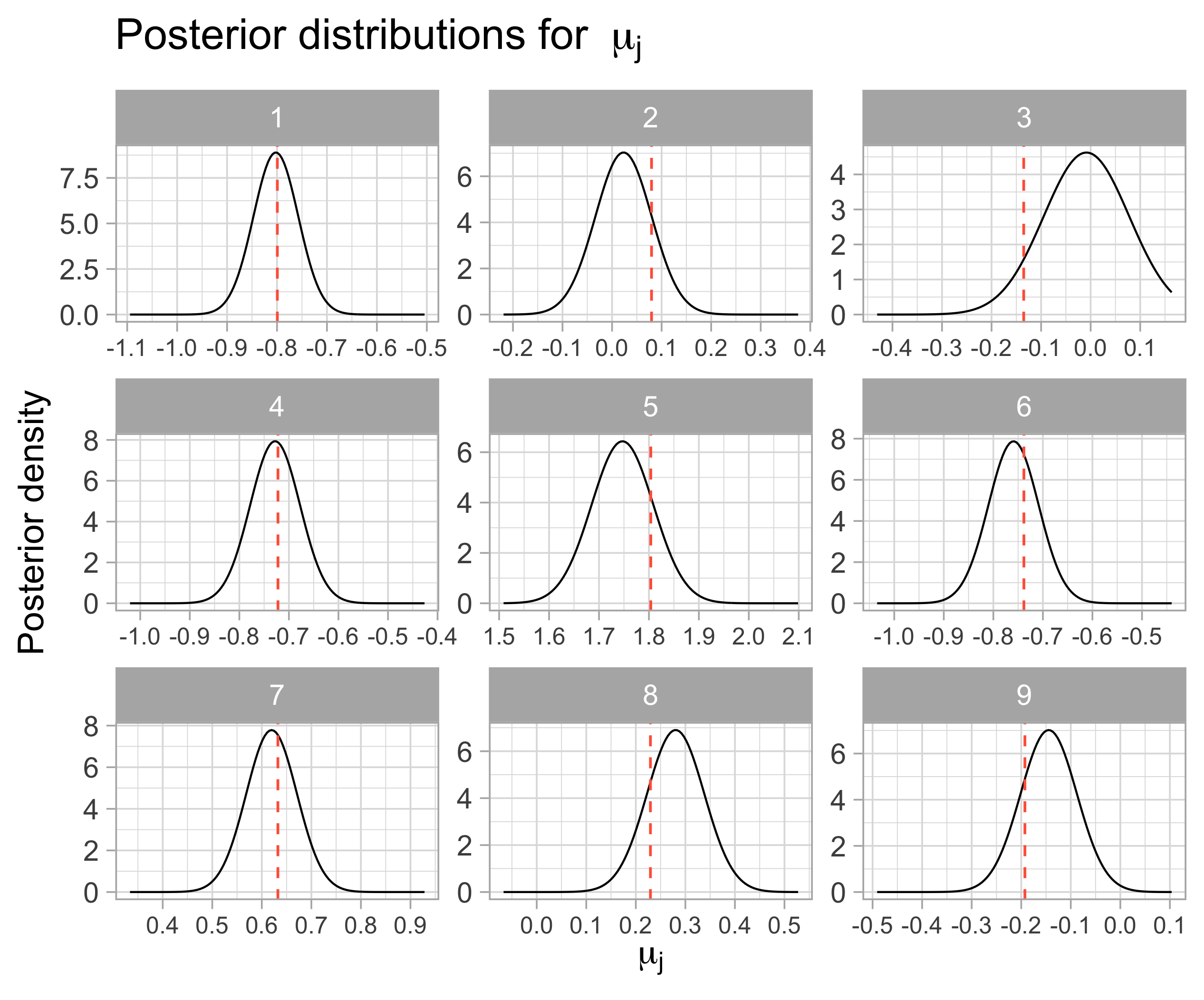 In all plots, the dashed red lines represent the ‘true’ values for each parameter. Ideally, these values should maximize the posteriors. If that happens we can be more sure that our calculations are correct.