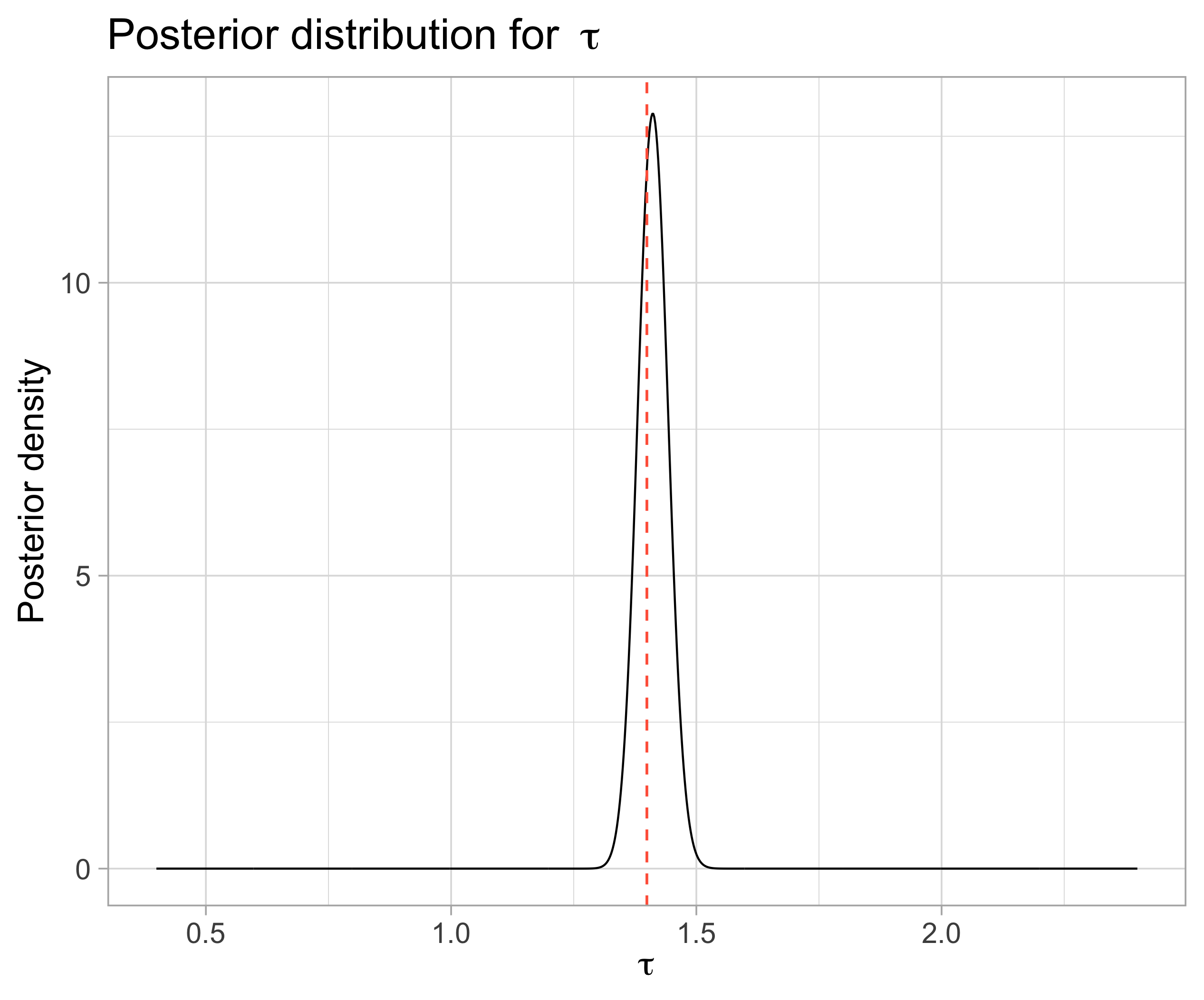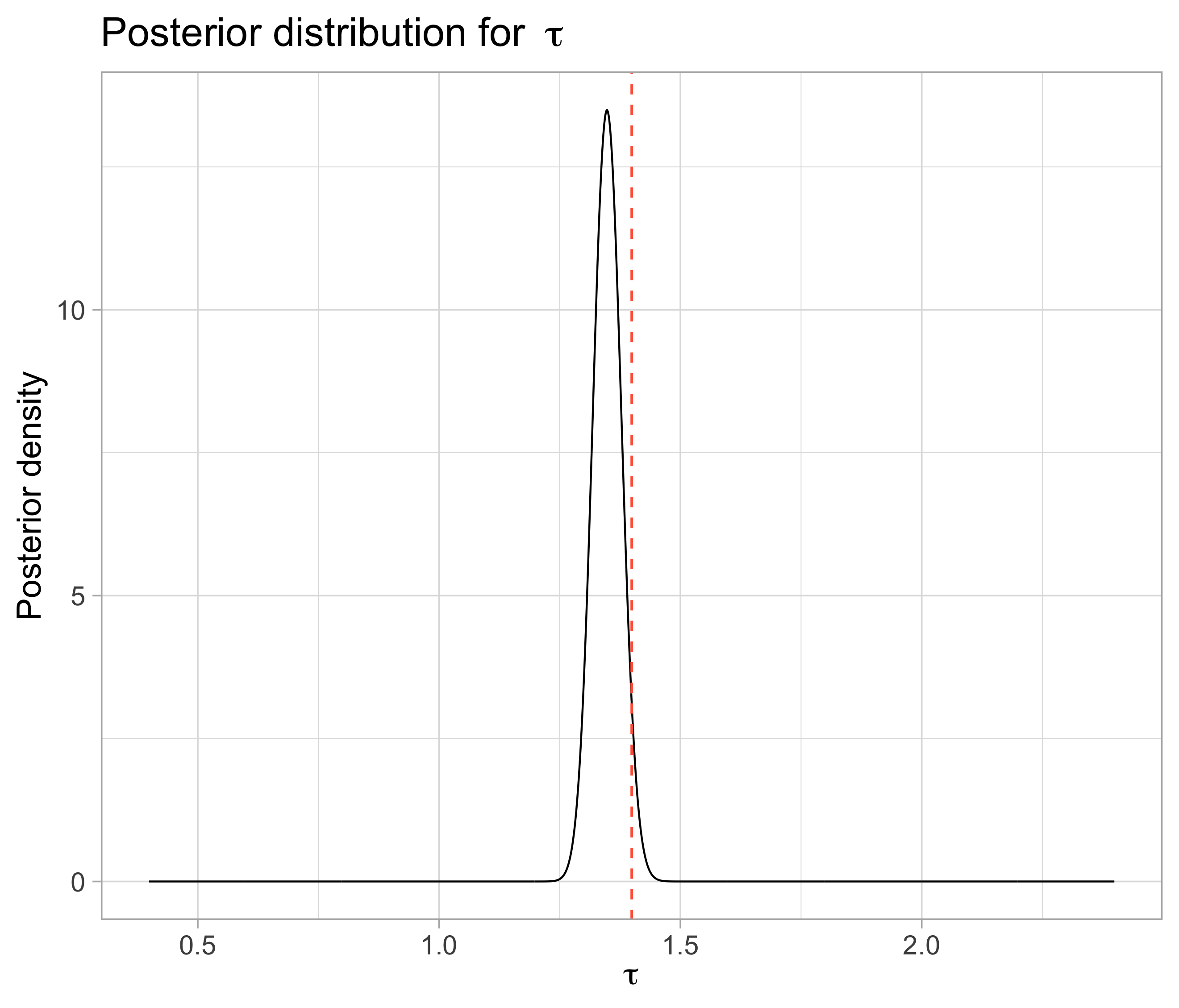 The posterior for \(\tau\) seem to have maximum at a value very close to the ‘true’ \(\tau\) (used to simulated the data)