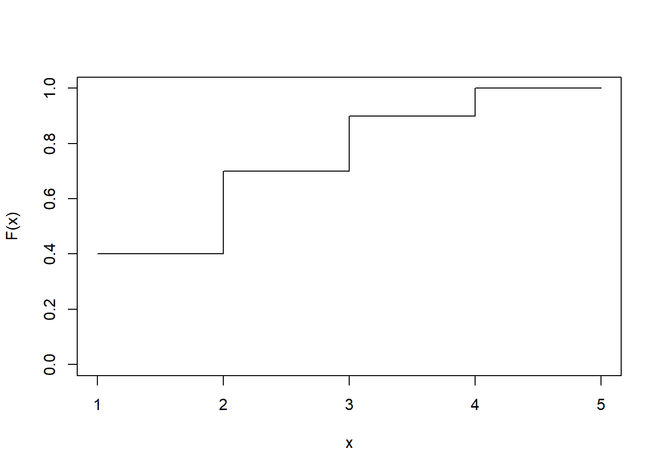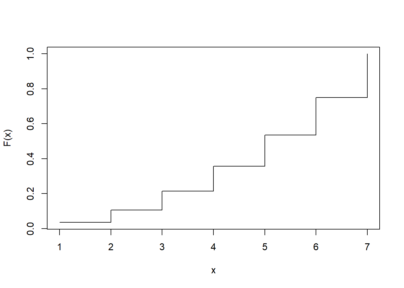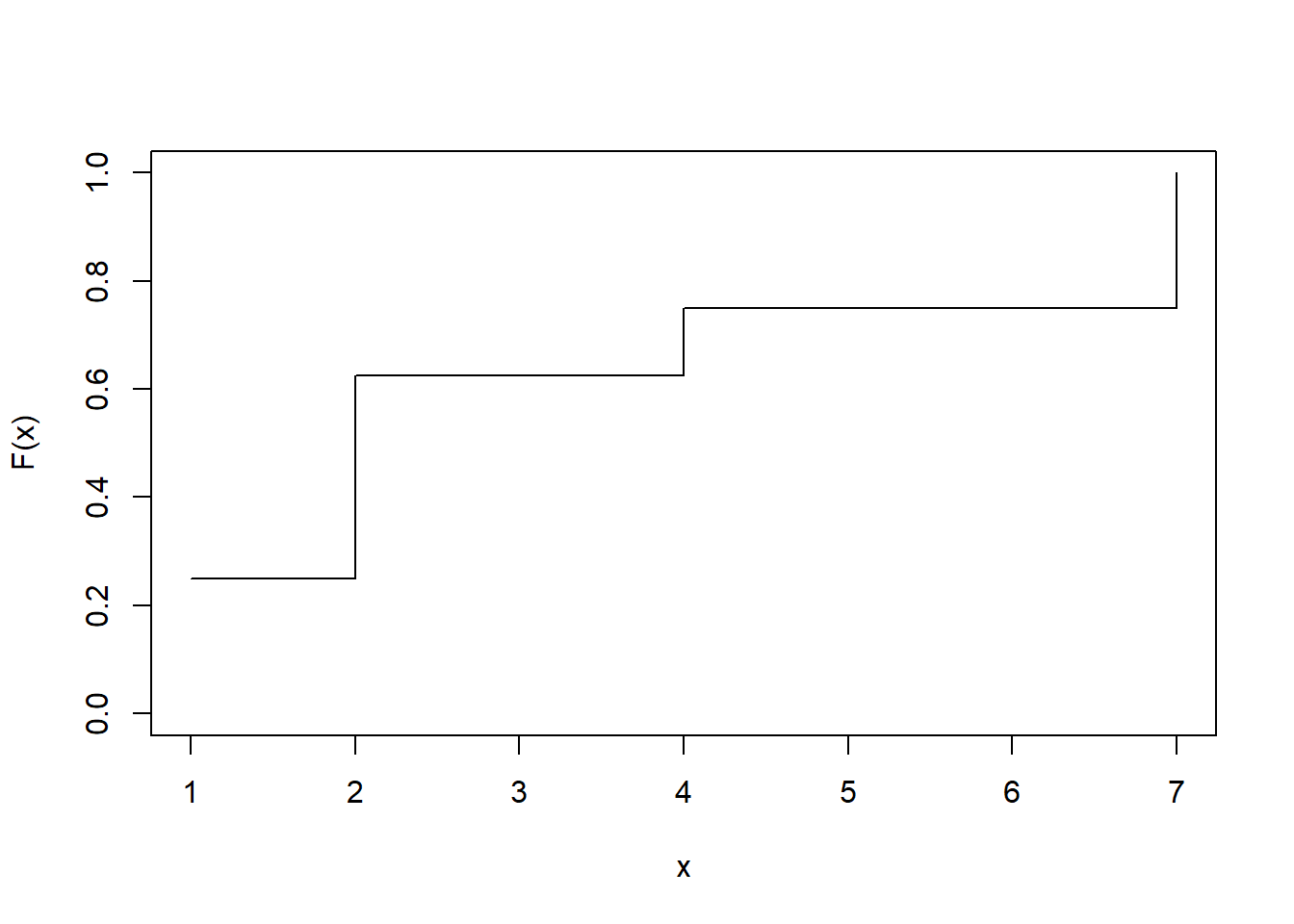 \(x\) 1 2 4 7 \(F(x)\) 0.25 0.625 0.75 1 ## [1] 1.25## [1] 0.250 0.625 0.750 1.000plot(c(1, 2, 4, 7), c(0.2, 0.5, 0.6, 0.8)/0.8, ylim = c(0, 1), type = "s", xlab = "x", ylab = "F(x)")