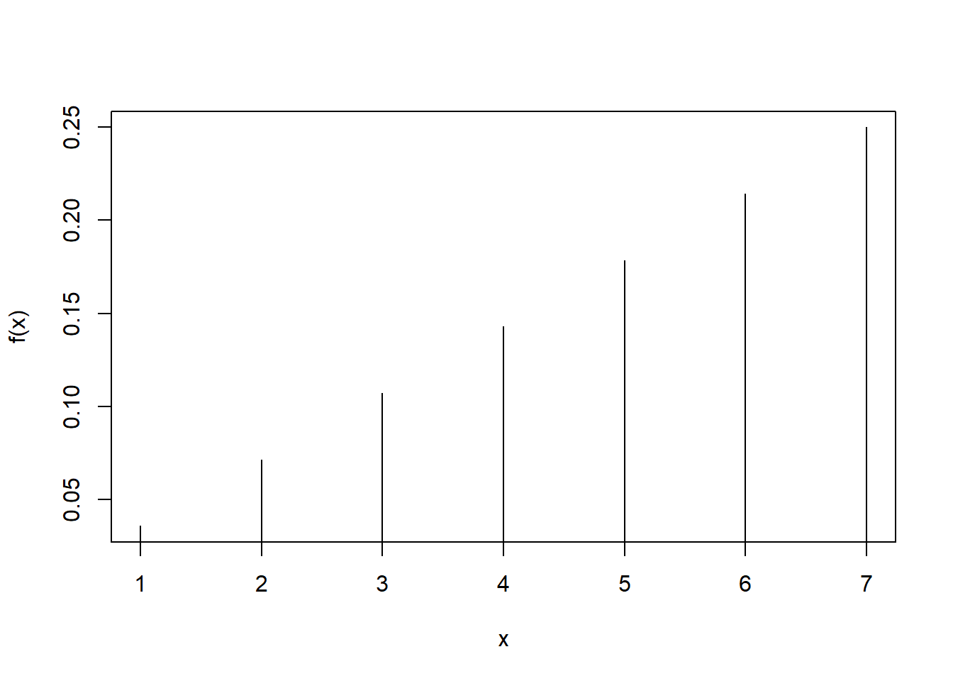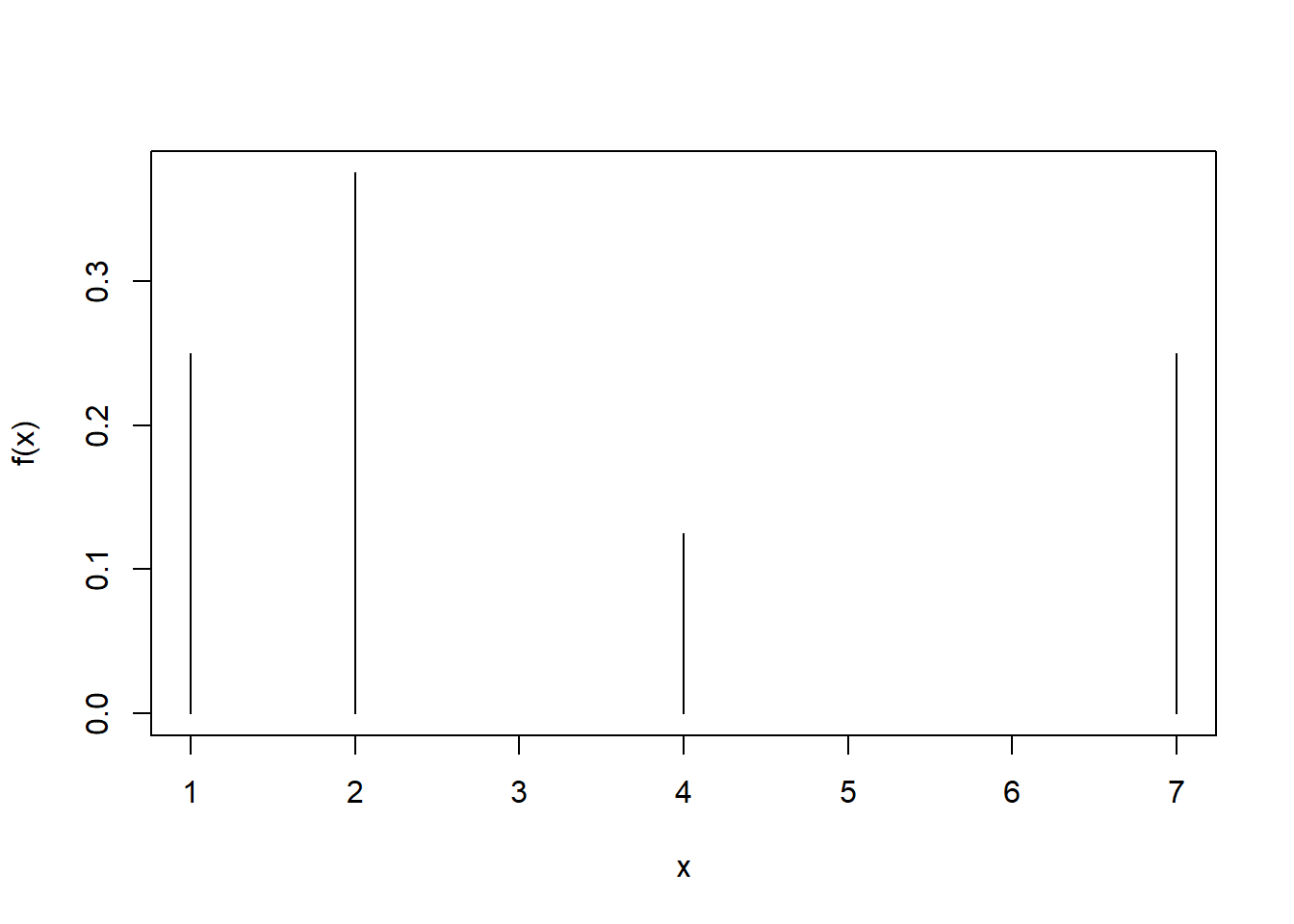 \(x\) 1 2 4 7 \(f(x)\) 0.25 0.375 0.125 0.25 ## [1] 0.250 0.375 0.125 0.250