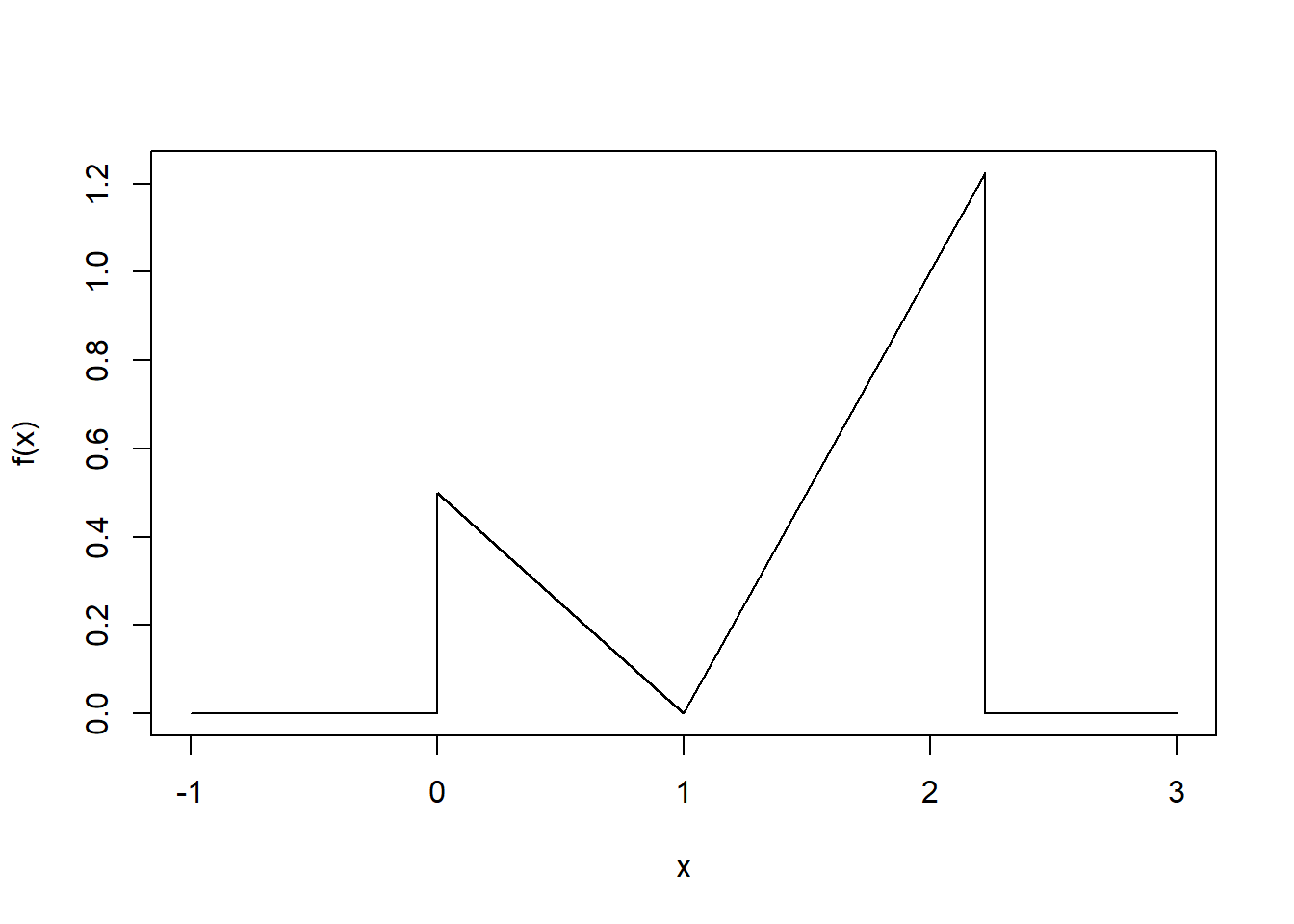 # E4 #a f <- Vectorize(function(x) { if (x < 0 | x >= 1 + (3/2)^0.5) return(0) if (x < 1) return(-1/2*x+1/2) if (x < 1 + (3/2)^0.5) return(x - 1) }) plot(f, from = -1, to = 3, n = 10001, ylab = "f(x)")
