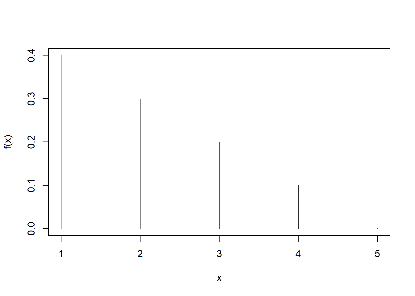 \(x\) 1 2 3 4 5 \(f(x)\) 0.4 0.3 0.2 0.1 0 ## [1] 15## [1] 1