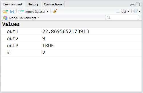 out3 <- out1 > out2Observem como ficou o Environment com os objetos criados: