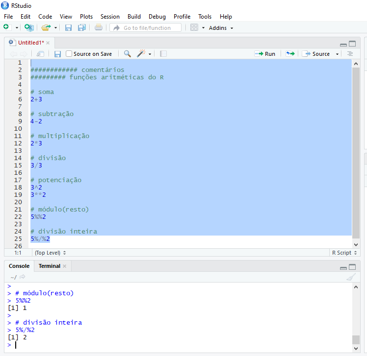 Você pode executar todos as linhas de um script ou optar executar apenas algumas poucas linhas ou trechos específicos desse código. Selecione o trecho que deseja executar e pressione Ctrl+Enter. Você verá, no console (janela abaixo do script) seu código sendo executado. Uma alternativa ao Ctrl+Enter é selecionar o trecho ou linha(s) e clicar em