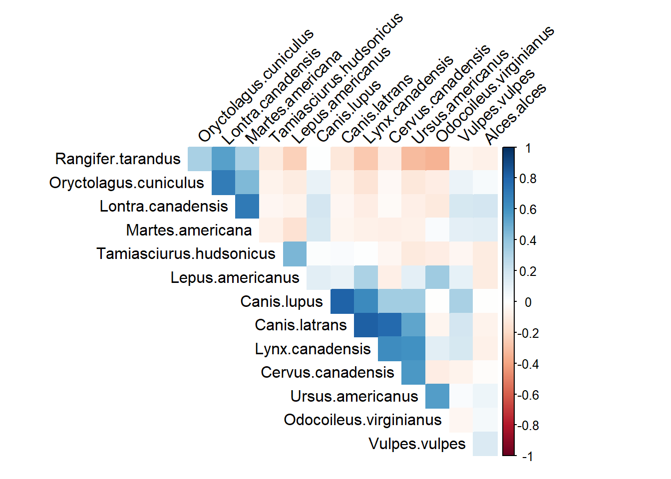 Camera trap data are being increasingly used to model multiple species communities. In the same way in which we used the corrplot package in the (analysis covariates section(#covariates), we can use it to explore the co-occurrence patterns of the species in the community.
