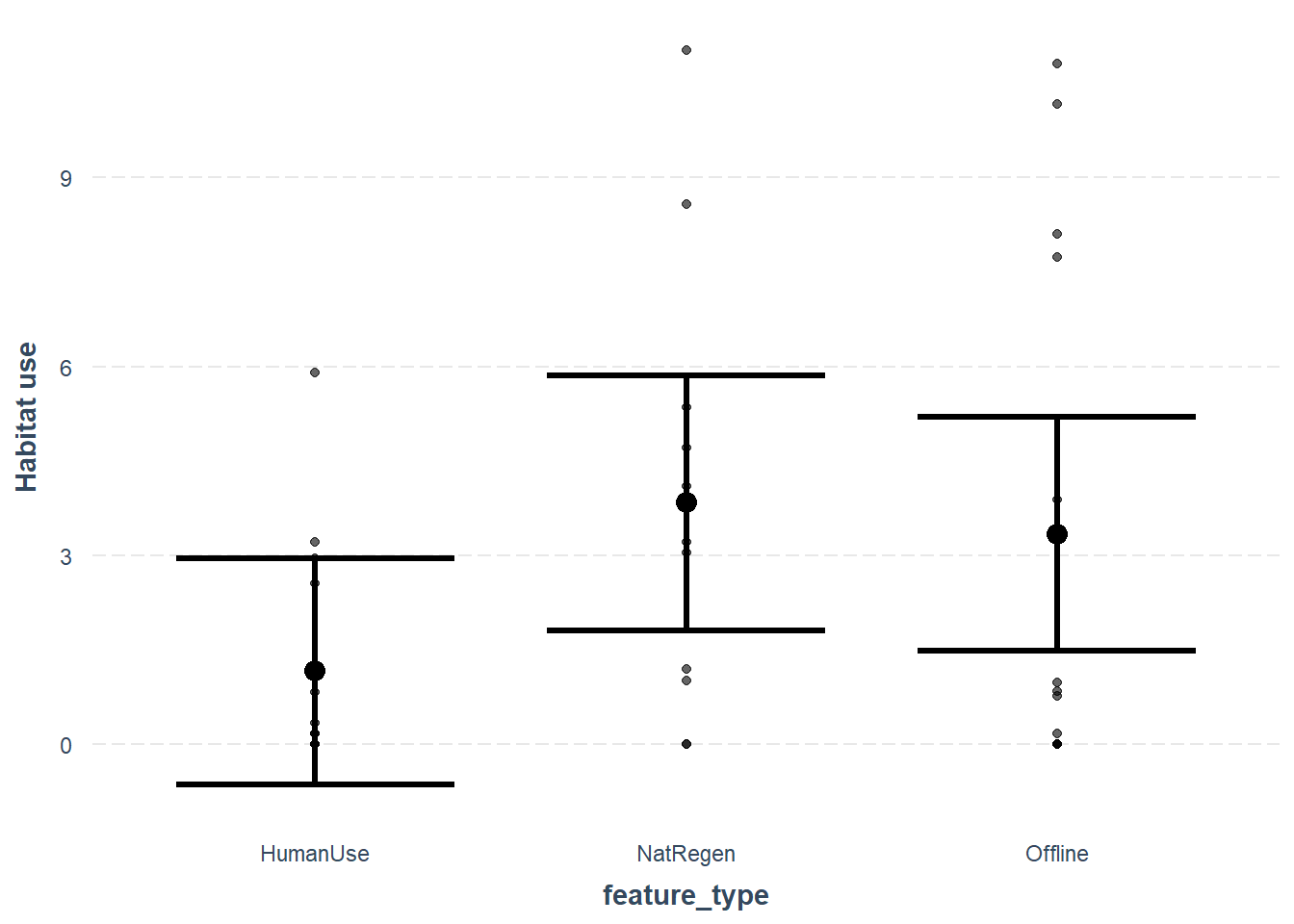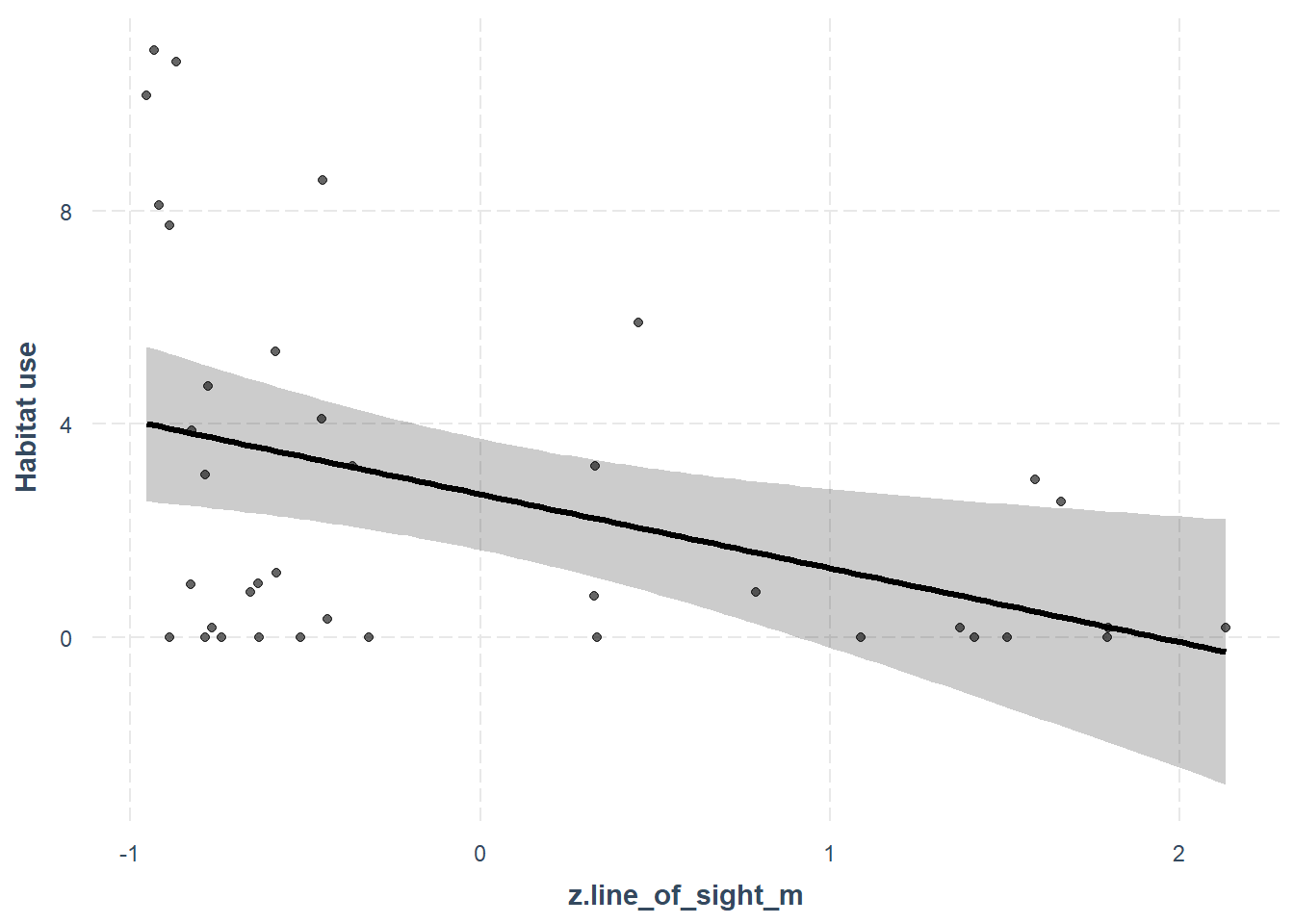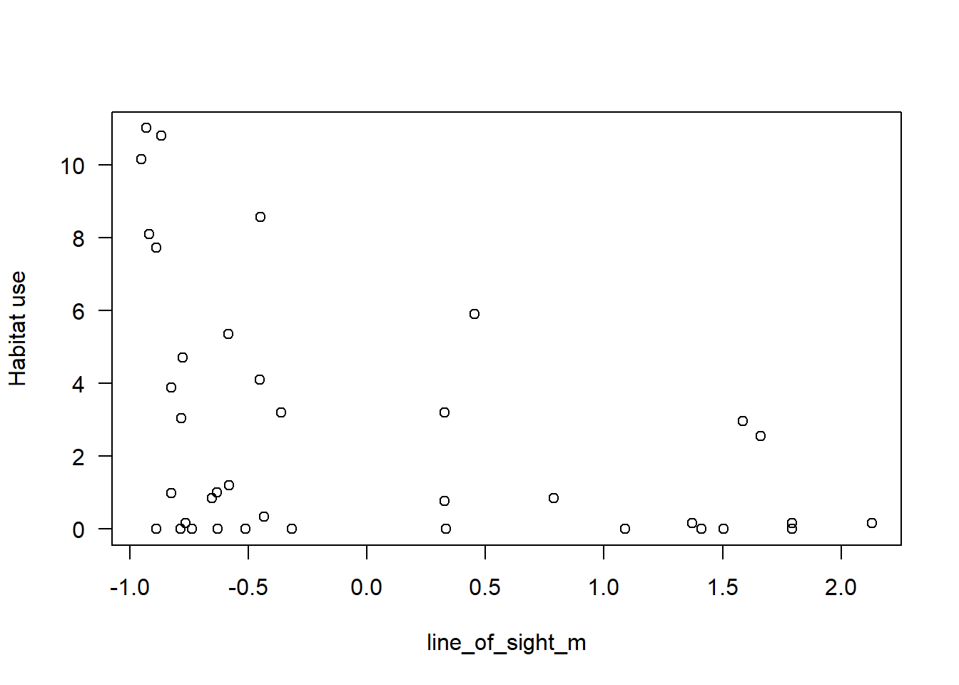 The most common way to analyse habitat-use data is through linear models. Linear models typically relate a continuous response variable - in our case capture rate - to a set of one or more discrete or continuous predictor variables. In this simple example we will explore the relationship between the capture rate of a species with the categorical ‘feature_type’ variable and the continuous line_of_sight_m variables.