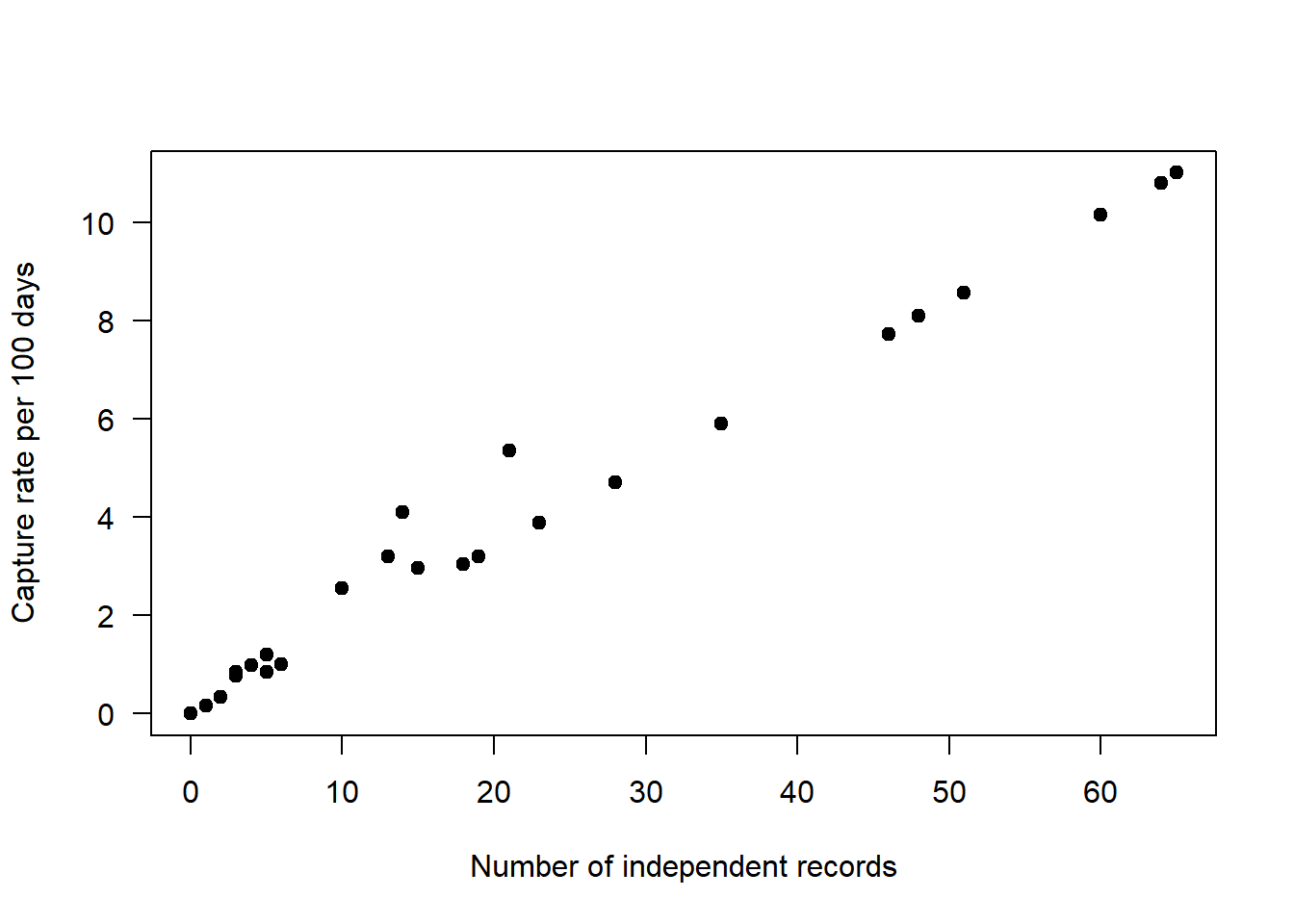 This ‘detection rate’ is thought to reflect the habitat use of a species at a given location. Extreme care should be taken if you want to equate use with abundance or density - something we discuss a little more in the density chapter.