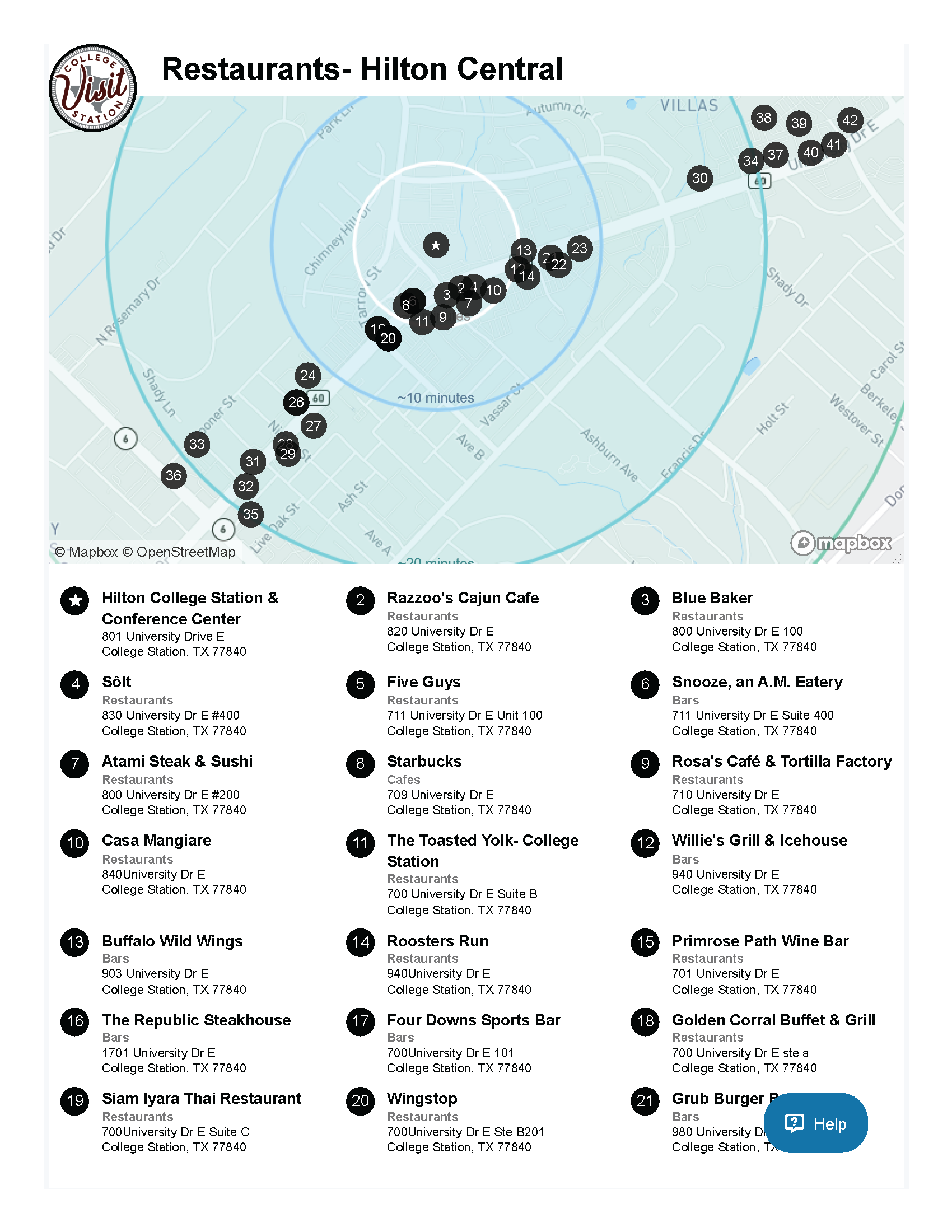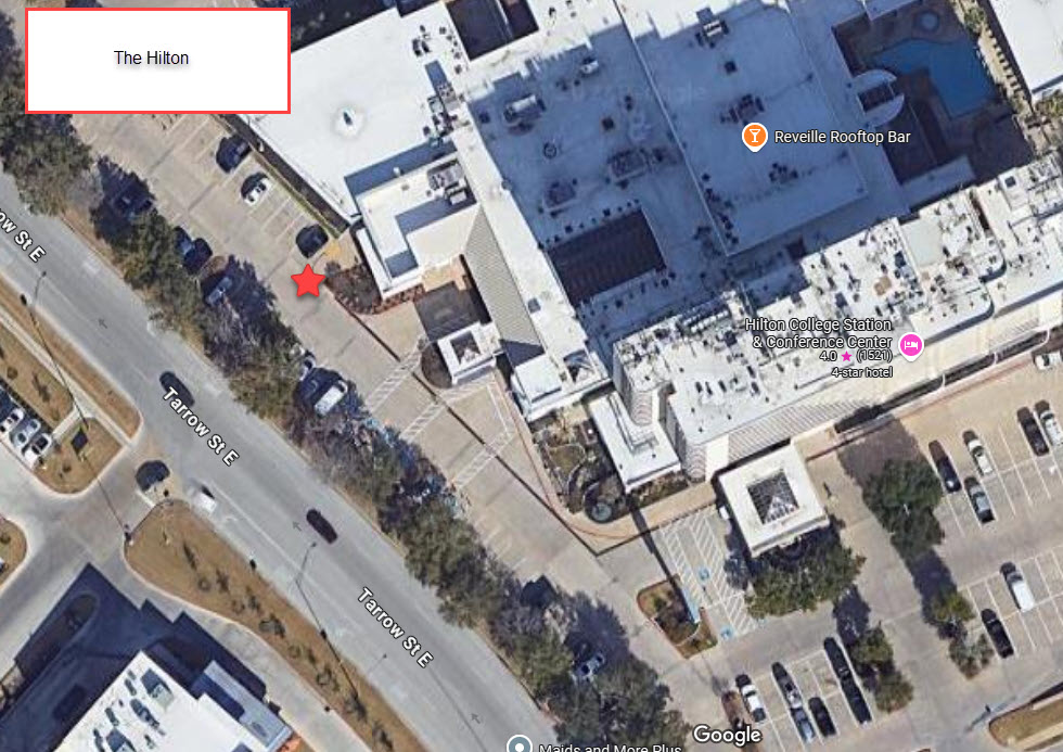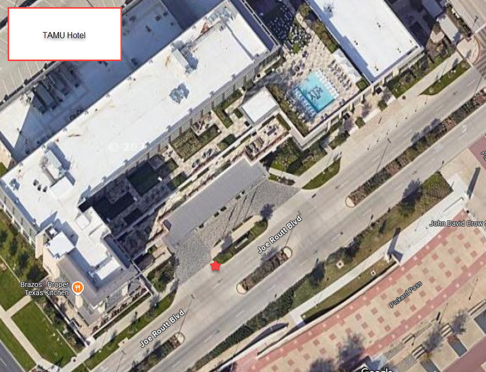 For those staying at the College Station Hilton, TAMU is providing us with shuttle buses to bring you to campus. They will drop off and pick up at the locations noted with a red star in the images below TAMU Hotel, Century Square, The Hilton, and Kyle Field.