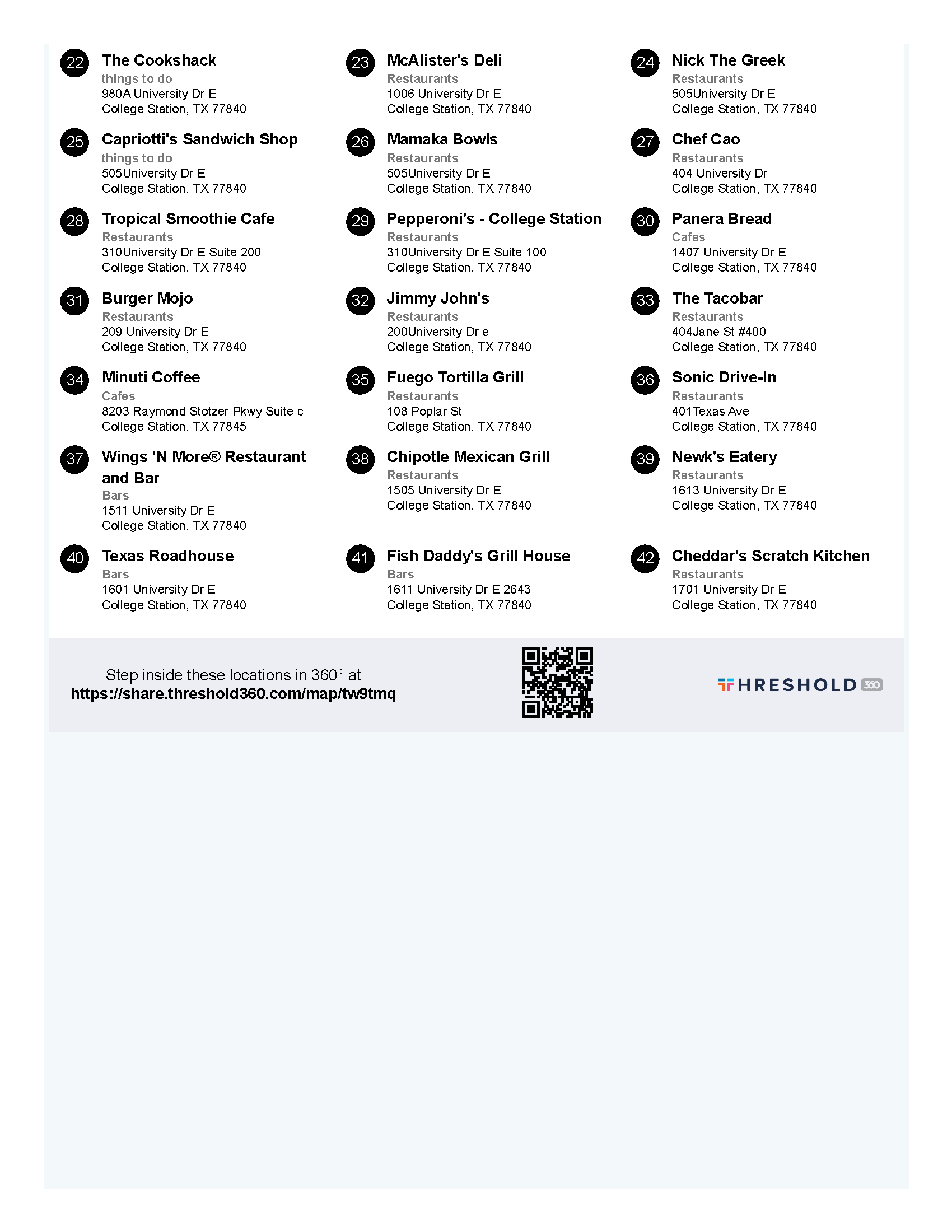 Continuous runs will be made between the TAMU Hotel/Conference Center, the Hilton Hotel, and the Century Square shopping area between 4PM and 10:30 PM (the attached pdf “Century Square” has a listing of dining options at that location). If you need a ride back to campus, please make sure you are on a bus by 10:15PM.