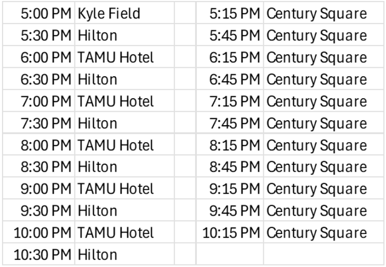 Continuous runs will be made between TAMU (initial runs leaving from Kyle Field, and then from in front of the TAMU Hotel/Conference Center) and the Hilton Hotel from 4:00PM and 10:30PM each day. If you need a ride back to campus, please make sure you are on a bus by 10:15PM.