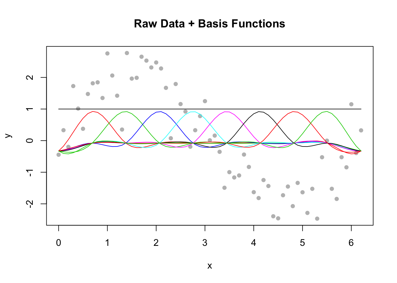 y <- 2*sin(x) + rnorm(n = length(x), mean = 0, sd = sd(2*sin(x) / 2))