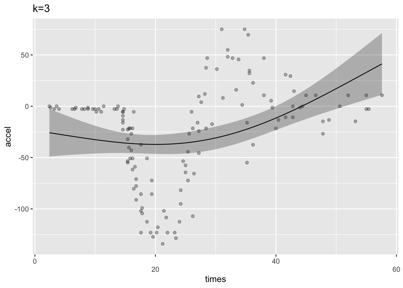 k3 <- gam(accel ~ s(times, k=3),data=mcycle)