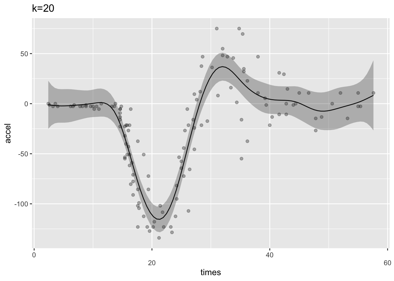 k20 <- gam(accel ~ s(times, k=20),data=mcycle)