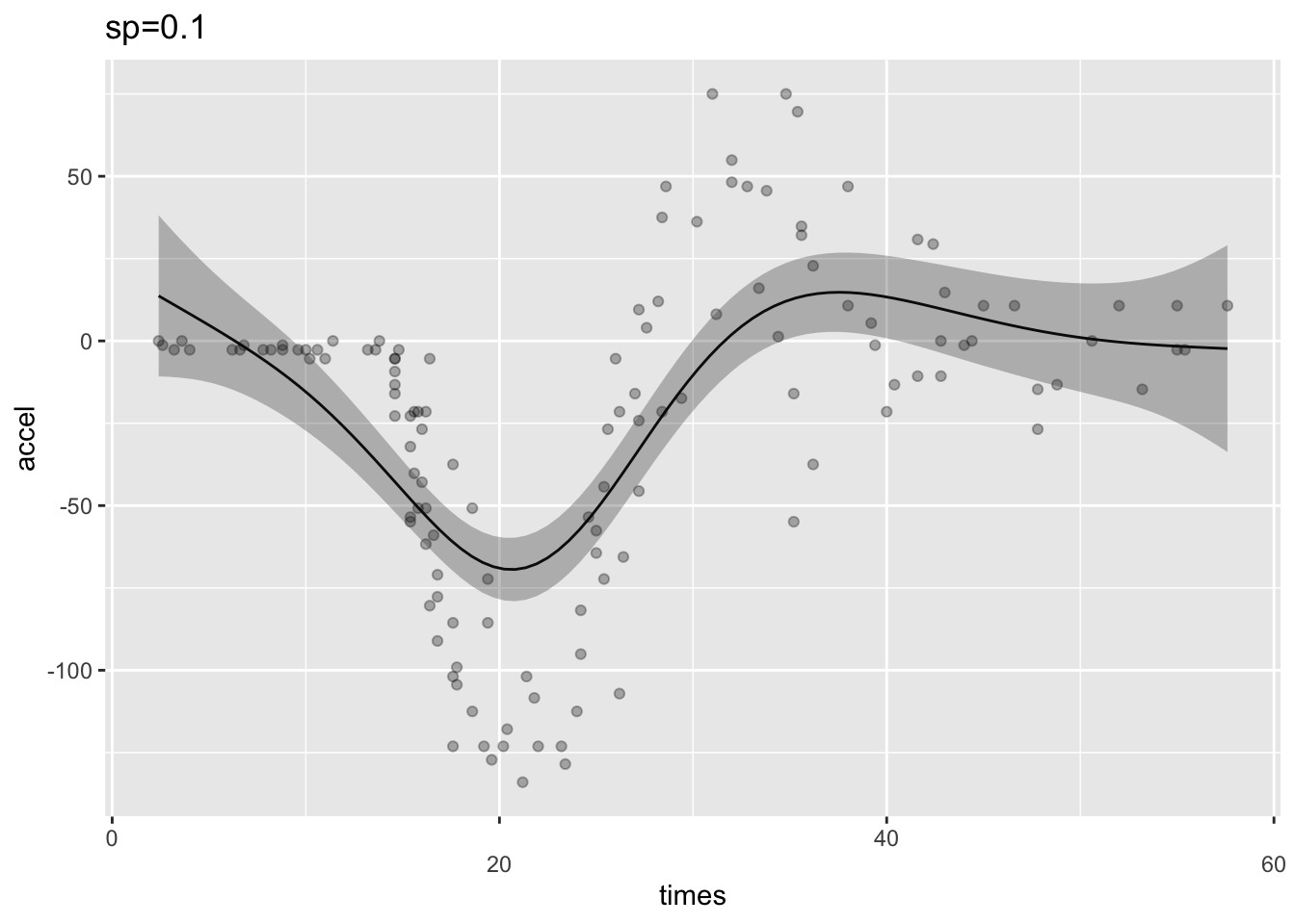 sp1 <- gam(accel ~ s(times),data=mcycle, sp=0.1)