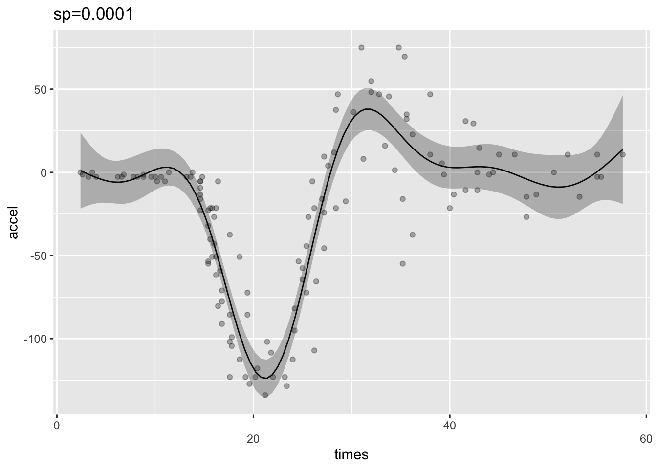 sp2 <- gam(accel ~ s(times),data=mcycle, sp=0.0001)
