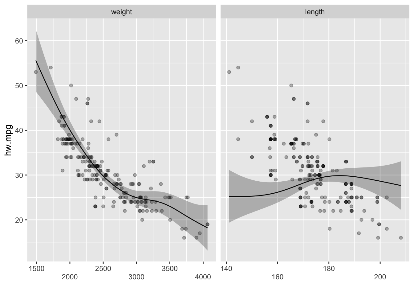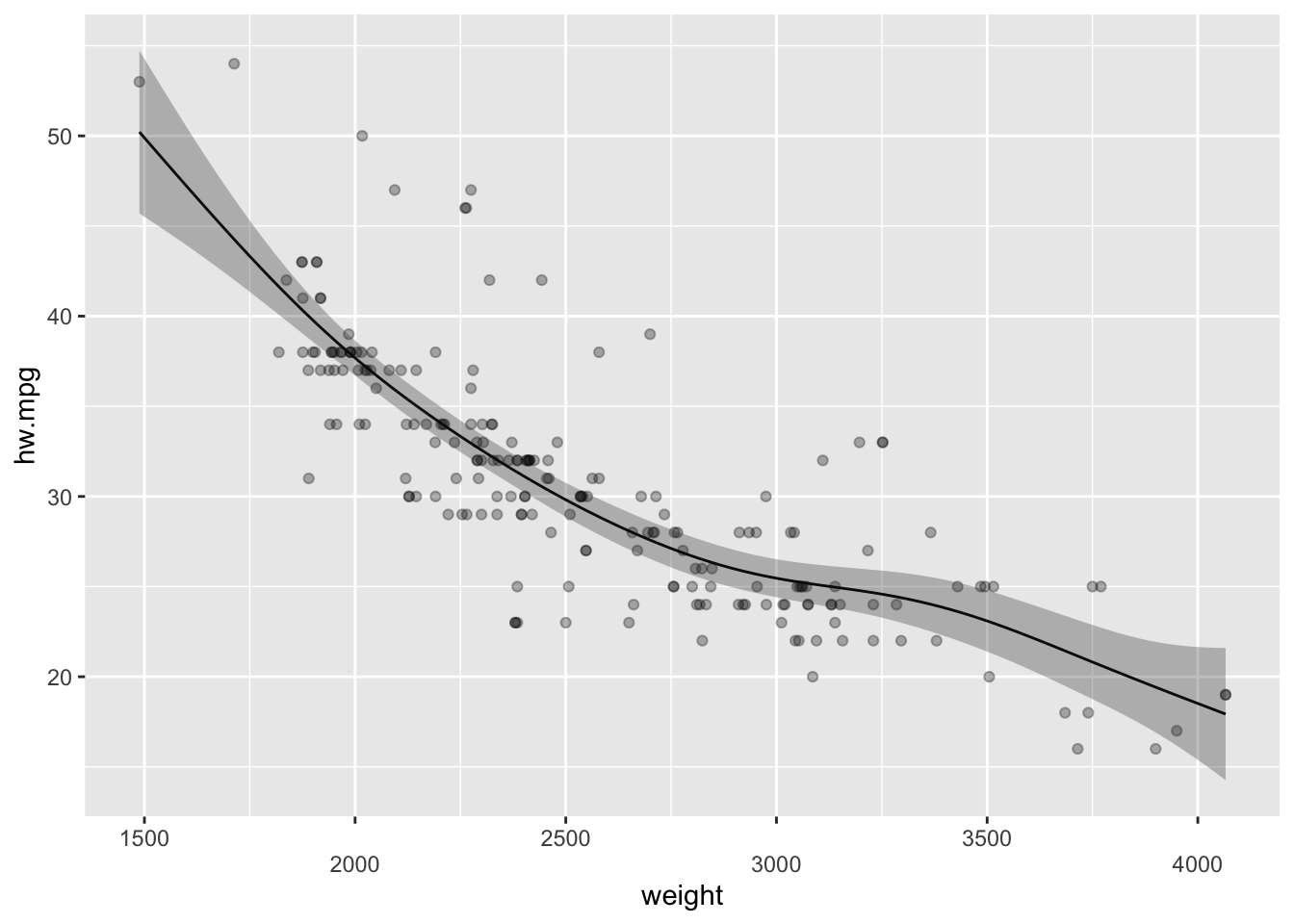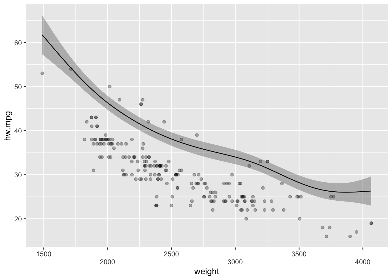 mpg데이터의 고속도로 연비(hw.mpg)를 반응변수로 하고 자동차 무게의 평활 스플라인을 설명변수로 하는 GAM 은 다음과 같이 만들 수 있다.