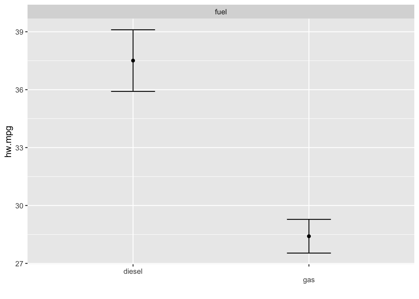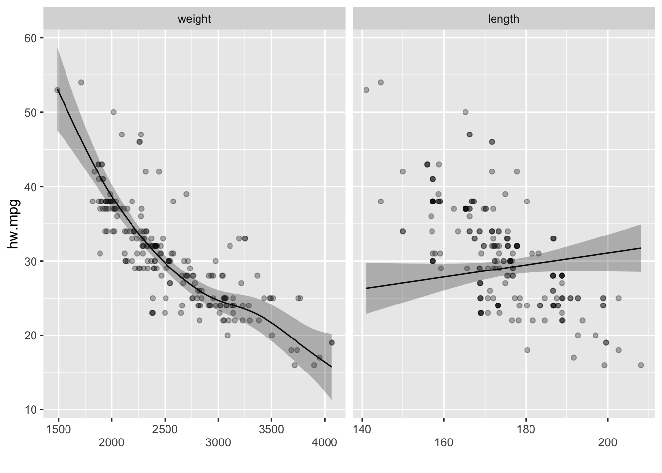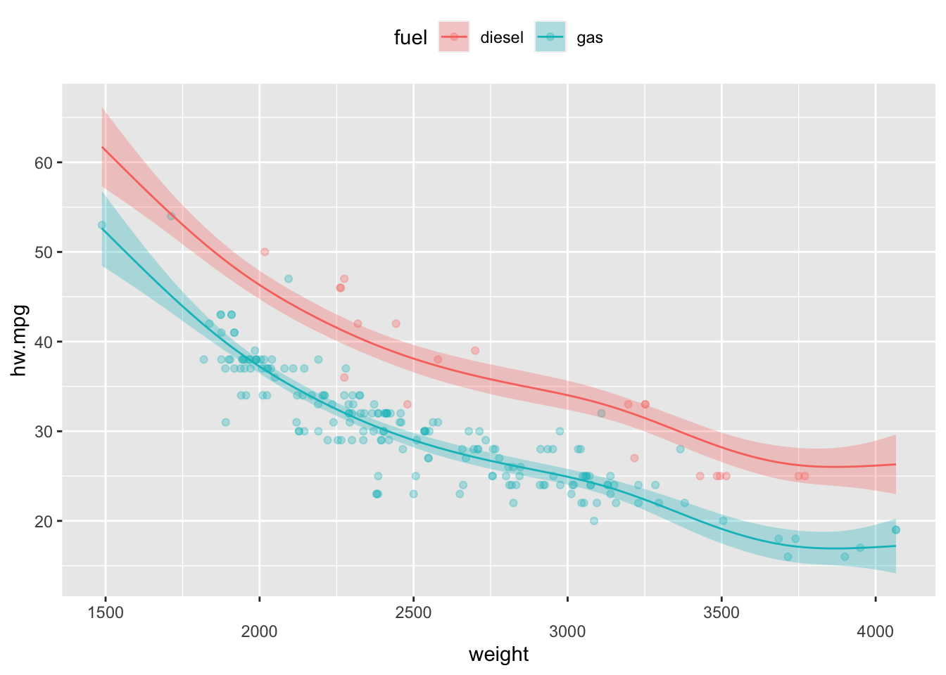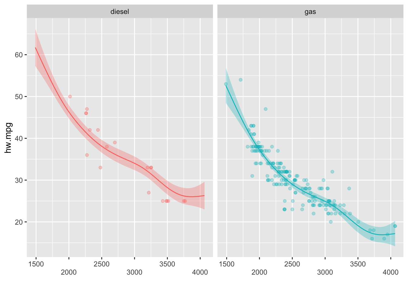 범주형 변수를 추가할 경우 선형항을 사용하면 된다. mpg 데이터의 fuel변수는 디젤유(diesel)과 가솔린(gas)의 두 개의 범주로 되어 있으며 이 변수를 선형항으로 추가할 경우 gam()함수는 각 범주에 따라 고정효과가 있는 것으로 모형을 적합시킨다. 그 결과 가솔린의 연비가 떨어지는 것을 볼 수 있다. 반대로 디젤 자동차의 연비가 보다 우수하다고 할수 있다. 이 모형에서 자동차의 무게에 의한 비선형효과는 자동차 연료의 종류에 관계 없이 같은 효과를 보인다. 이는 선형회귀모형에서 기울기의 변화 없이 절편만 달라지는 것과 마찬가지이다. 한가지 주의할 점은 범주형 변수를 사용할 때에는 반드시 factor로 사용해야 한다는 점이다. mgcv 패키지에서는 문자형 변수를 사용하지 못한다.