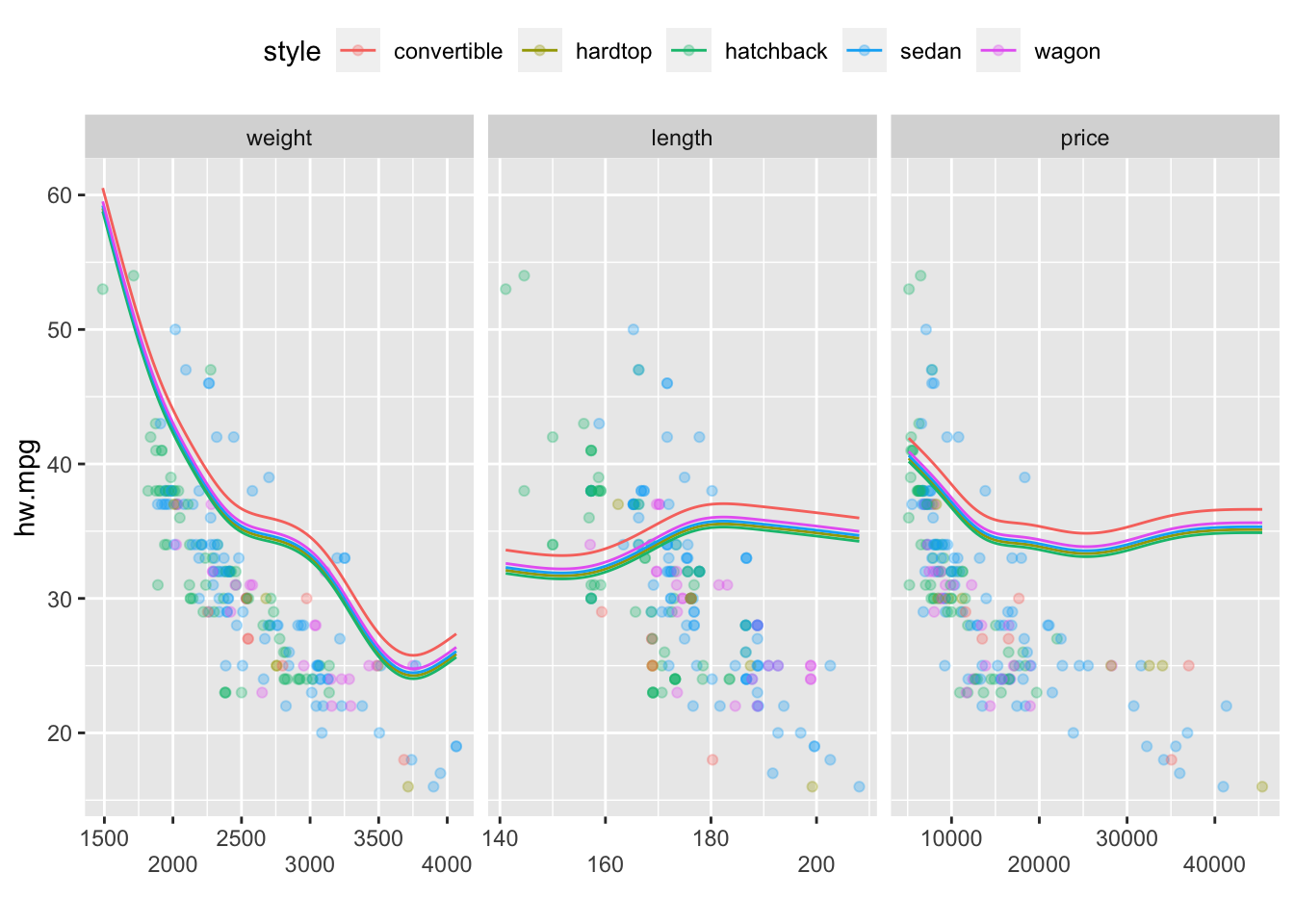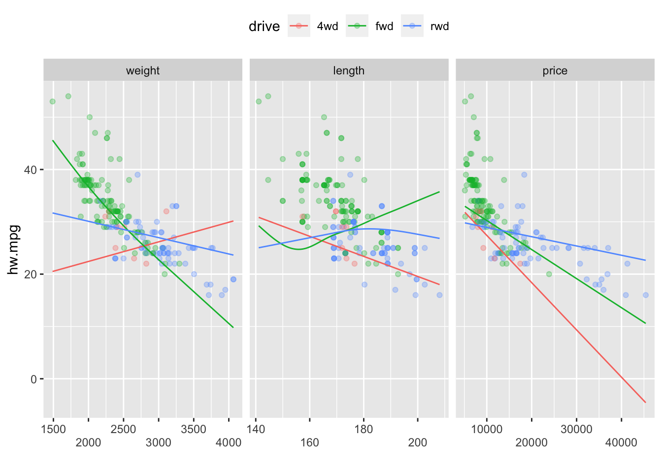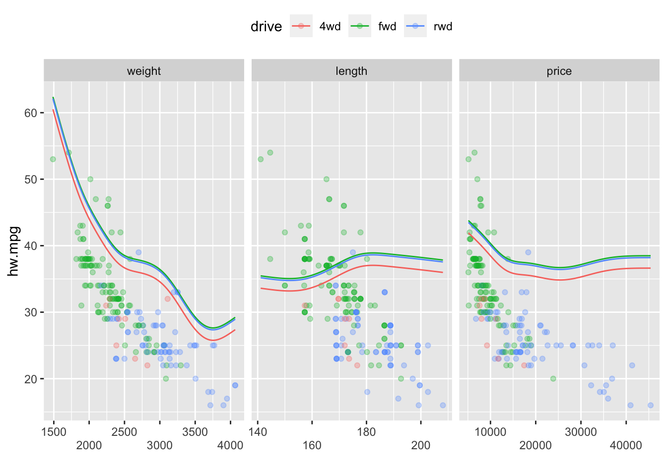 model10 <- gam(hw.mpg ~ s(weight,by = drive) + s(length, by = drive) + s(price, by= drive)+drive,