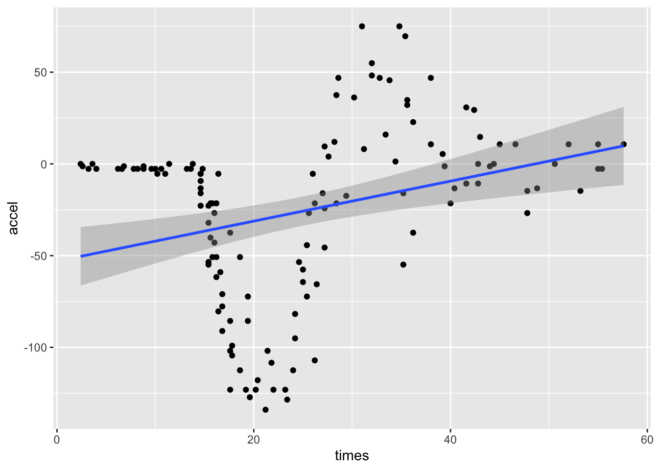 lm(formula = accel ~ times, data = mcycle)