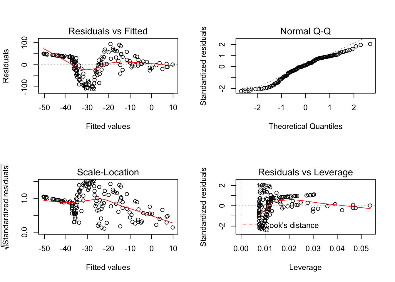 이 회귀모형의 설명력은 매우 낮으며(\(R^2 = 0.087\)) 중요한 관계를 놓치고 있다. 이 회귀모형의 진단을 위해 다음 그림을 살펴보자.